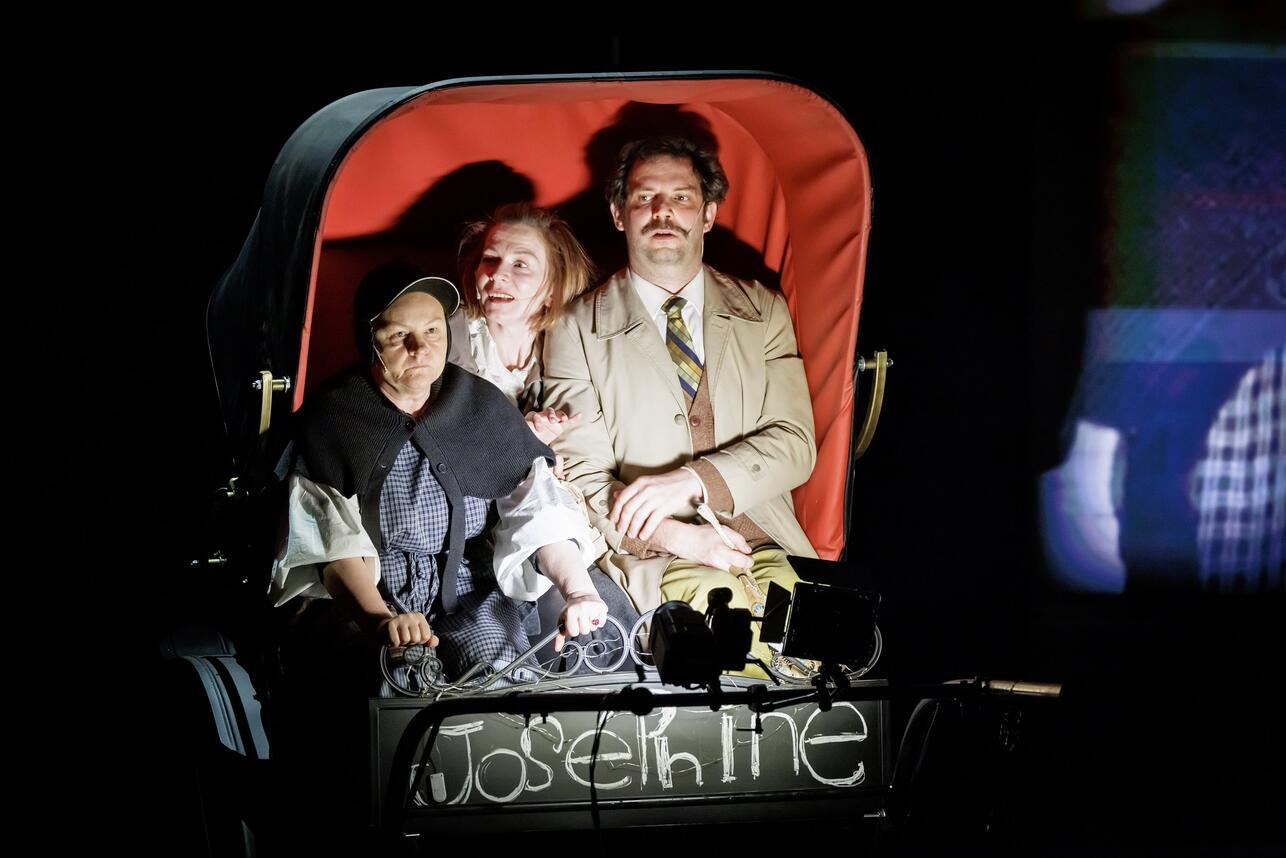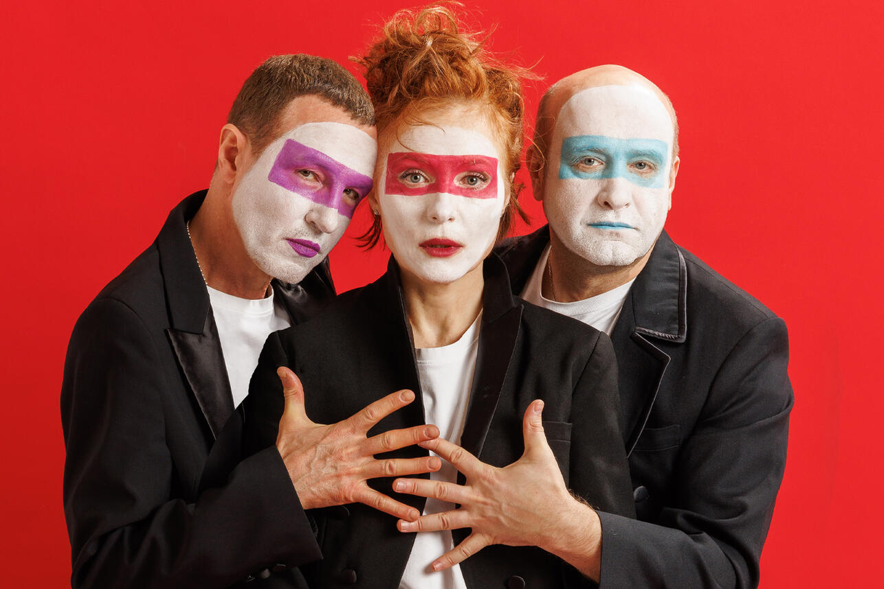 Игорь Верник, Полина Кутепова и Виталий Коваленко в спектакле Петра Шерешевского «Торговцы резиной» по пьесе Ханоха Левина.