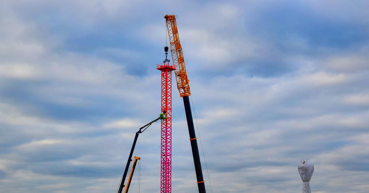 «Башня состоит из пяти секций. На земле элементы собираются попарно, после чего при помощи двух мощных кранов конструкции аккуратно поднимаются и переводятся в вертикальное положение — один кран удерживает нижнюю часть, второй —обеспечивает плавный подъём, и далее секции стыкуются друг с другом», — объясняет технический директор «Острова Мечты» Глеб Пауль.