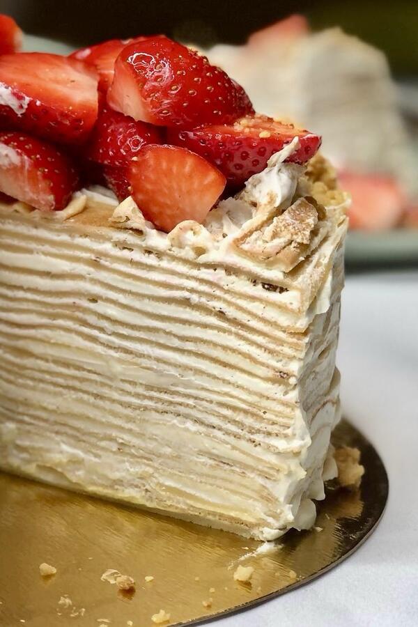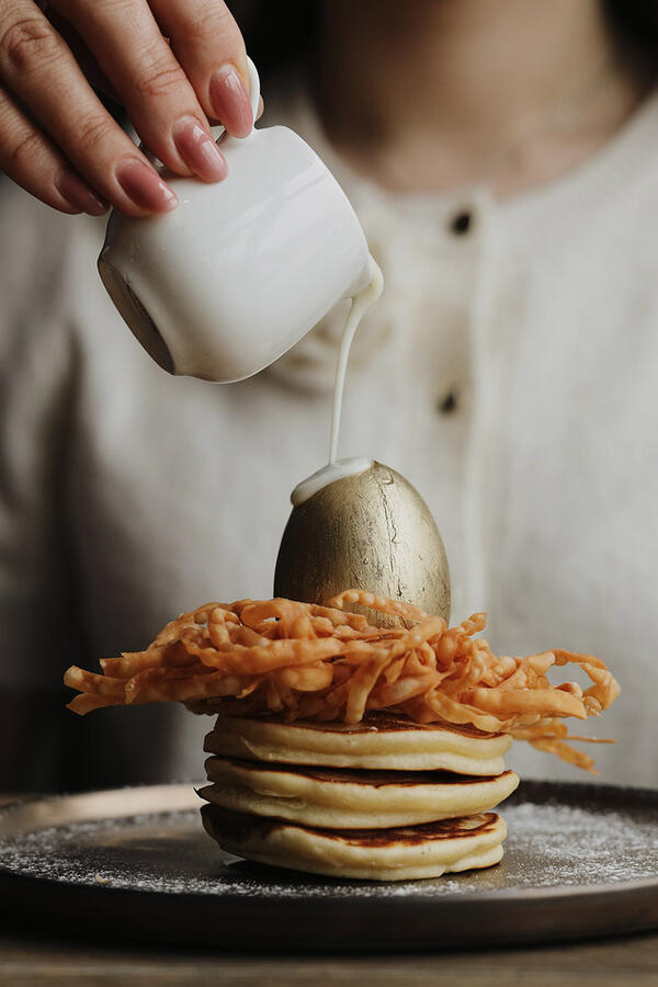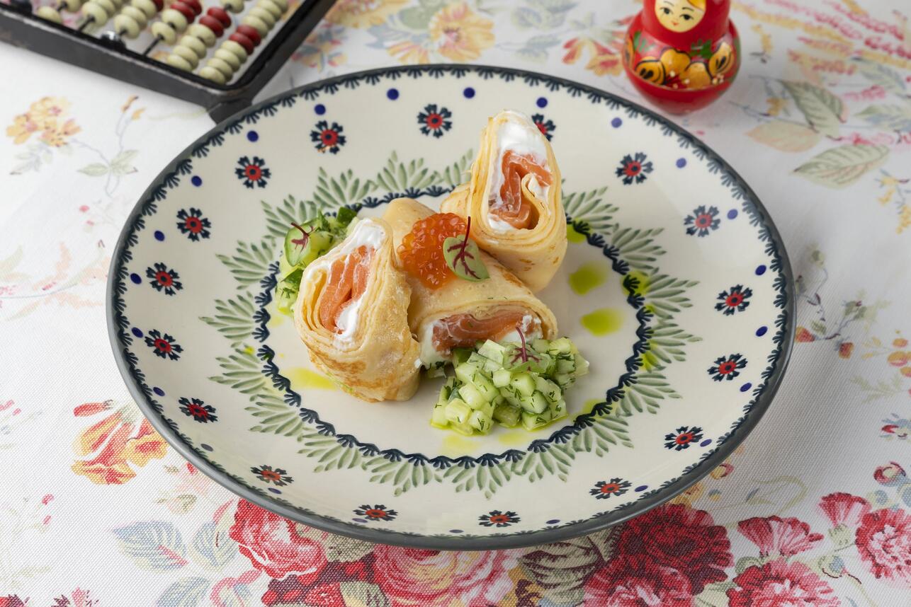Пробовать предлагают торт из воздушных блинов на пшеничной муке, прослоенных нежным кремом из маскарпоне и сливок и покрытых хрустящей песочной крошкой штрейзель, блины со слабосоленым лососем собственного посола (на водке, соли и сахаре), авокадо, кремом из сливочного сыра и икры тобико и изысканной солью флер-де-сель и блинчики с начинкой из говядины, отварного куриного яйца, зелени и лука, которые подаются с домашним брусничным соусом и нежной сметаной.В