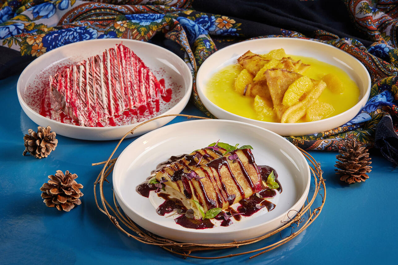 На масленичной неделе можно попробовать блинный торт с барбарисом и маскарпоне, блины с томленой олениной и клюквенным соусом и блины креп-сюзетт с апельсиновым соусом куантро.