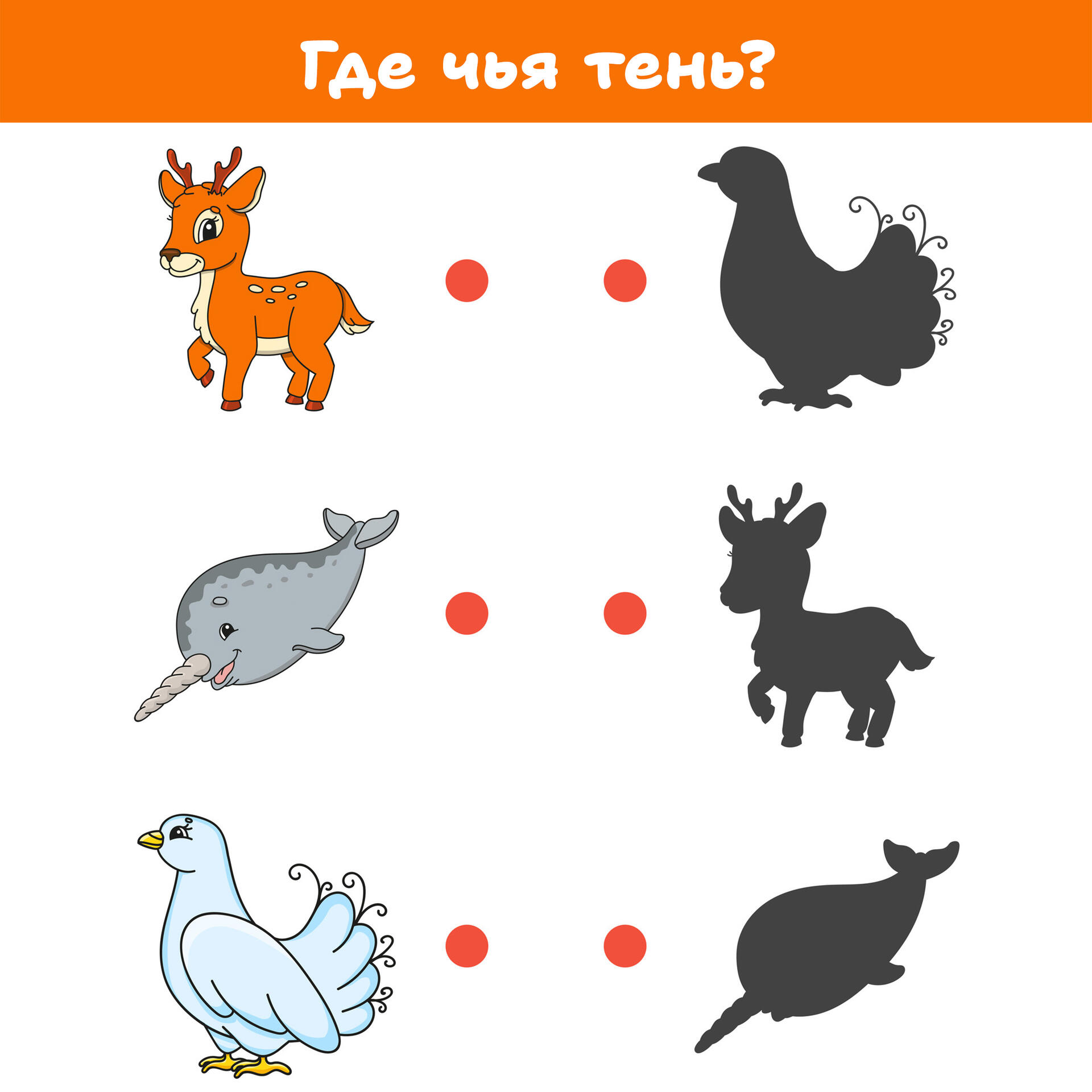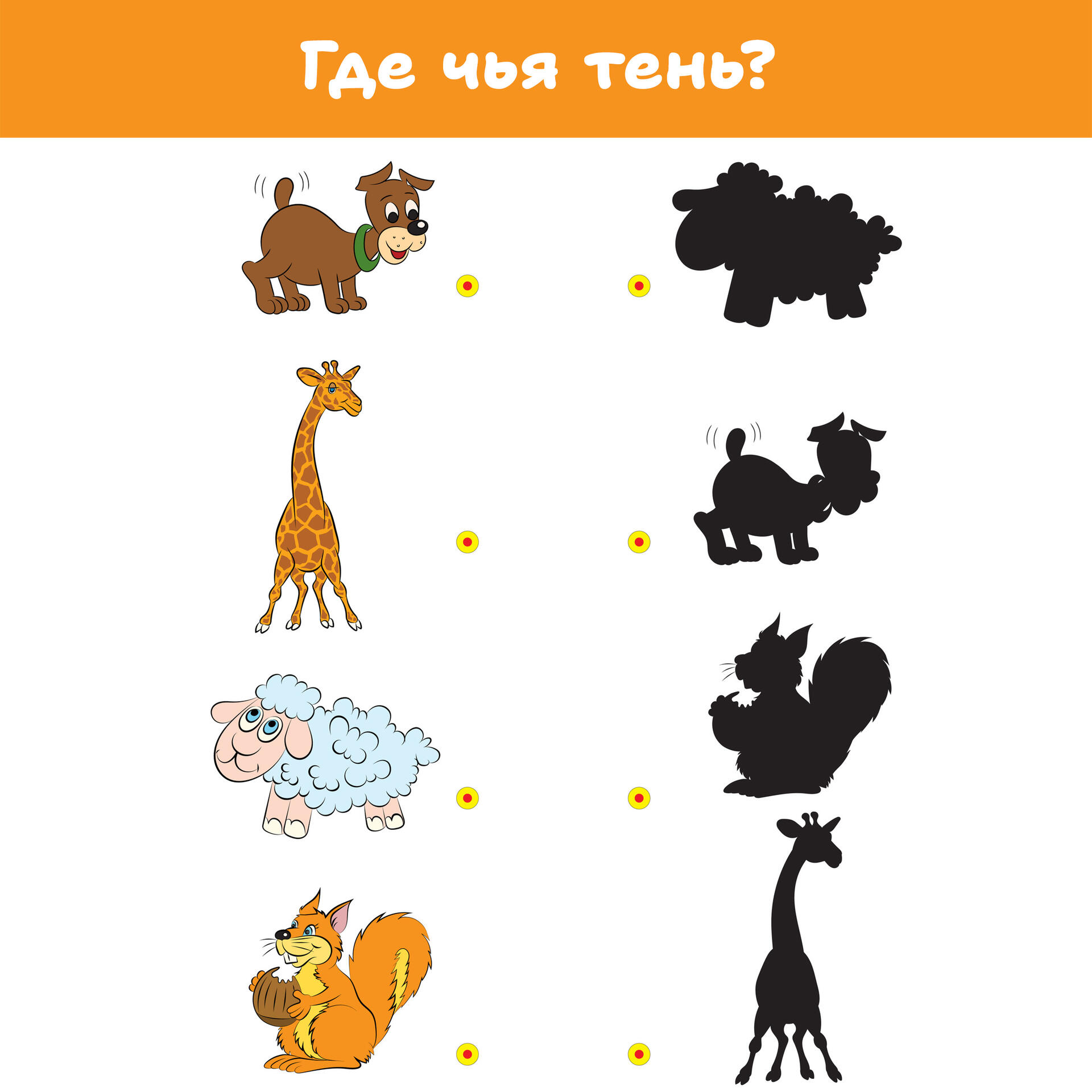 Игра-развивашка «Где чья тень?» — это простой и яркий способ занять ребенка с пользой! Задача простая: малышу нужно сопоставить красочные картинки с их черными силуэтами.