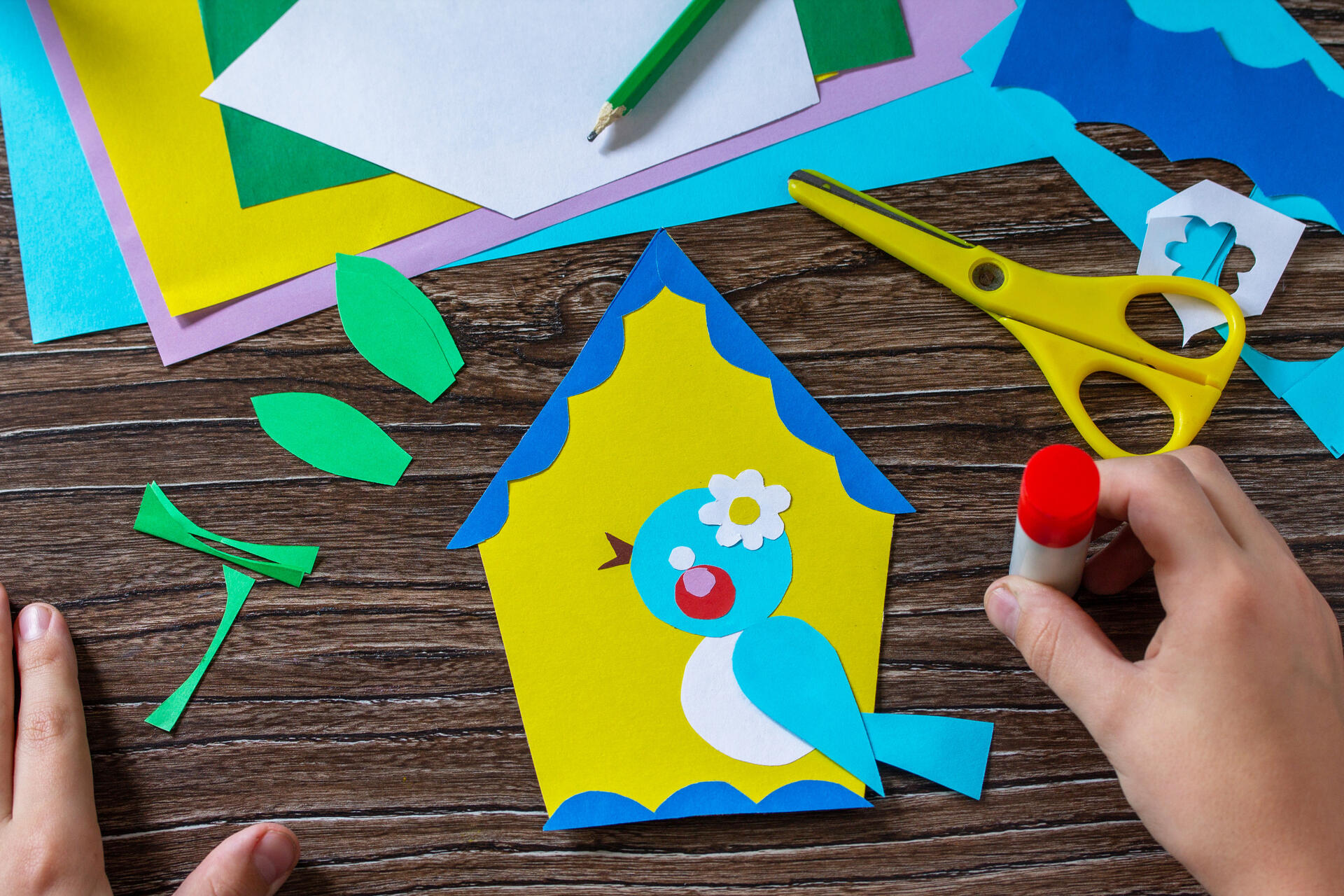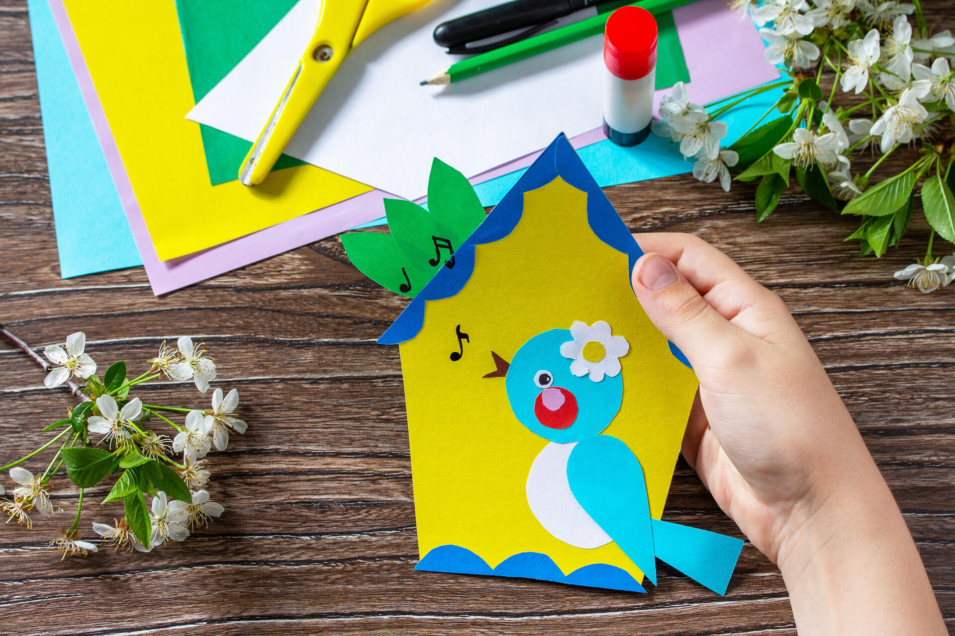 Аппликация 1. Поющая птичка в скворечнике