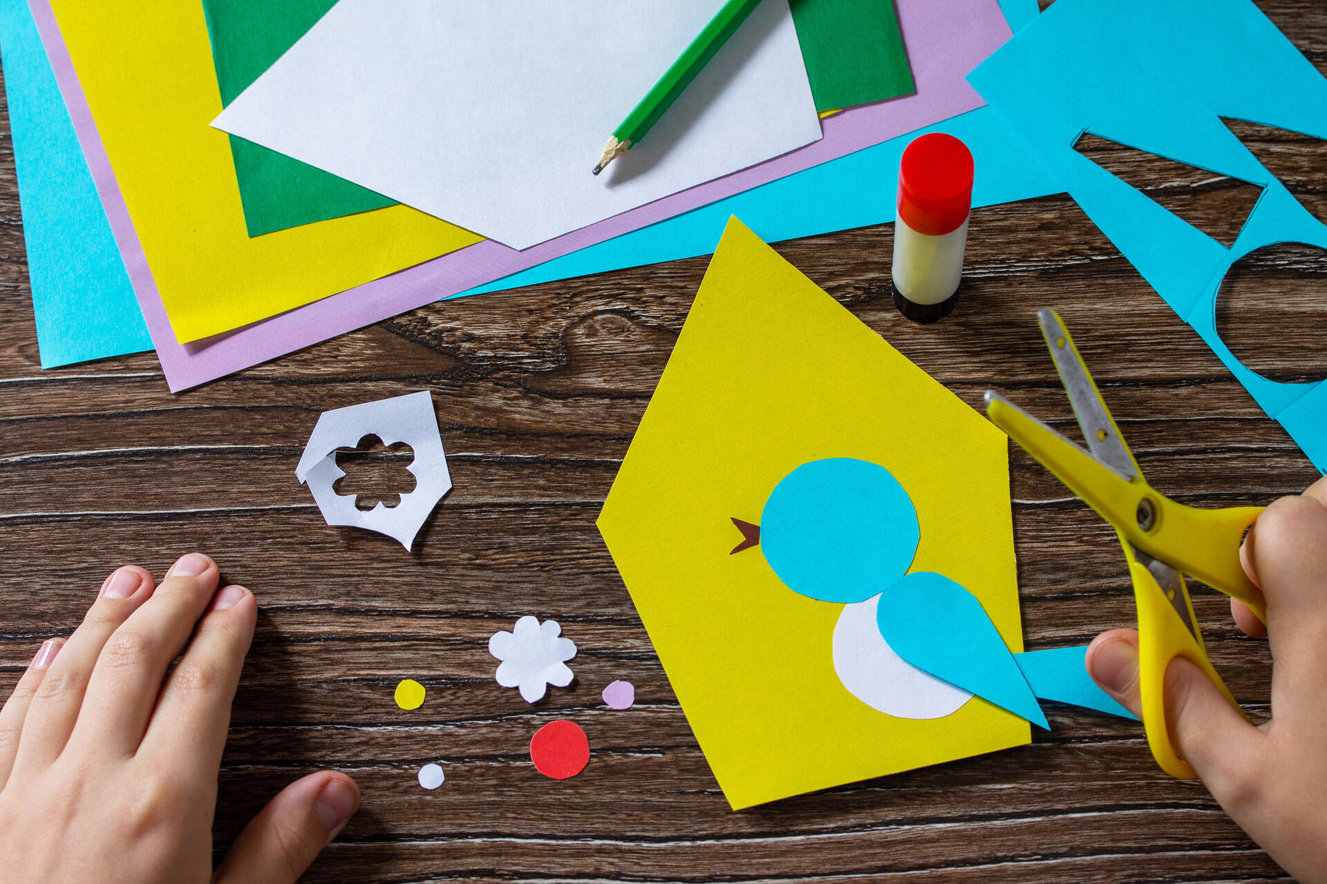 Мелкие детали — клюв, глазик, щечку, цветочек и крошечную ноту — вырезать не так-то просто. Здесь, возможно, понадобится помощь взрослых (рис. 3). Осталось украсить скворечник и посадить в него птичку, как показано на рисунке 4.
