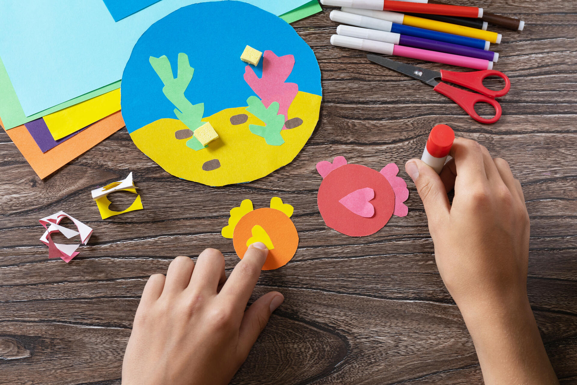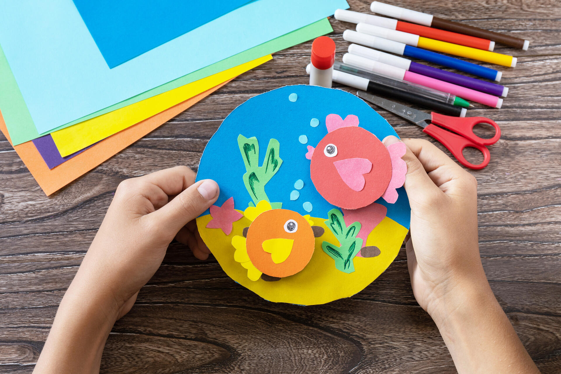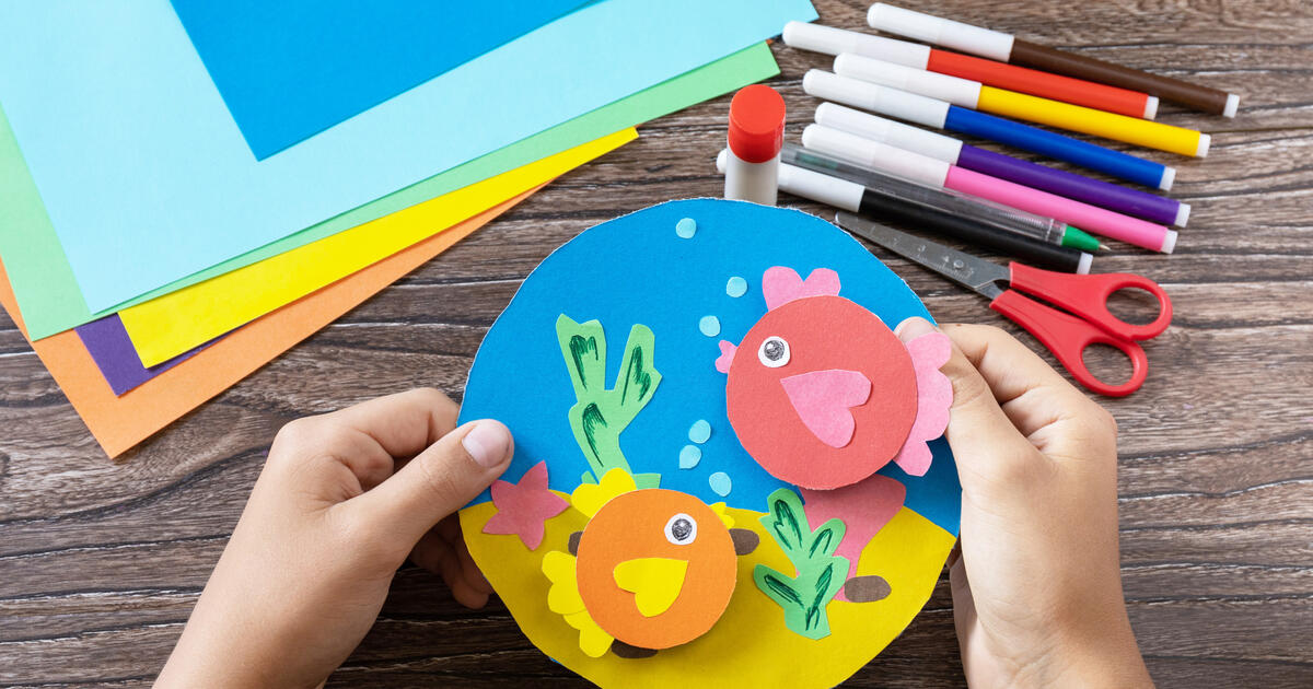 Вырежьте большой круг из синей бумаги — это будет вода. Сверху наклейте полоску «морского дна» желтого цвета (как показано на рисунке 1). Затем вырежьте маленькие кружочки — это туловища будущих рыбок. Плавники и пышные хвостики (они похожи на сердечки) приклейте к основе. Добавьте глазки — и рыбки оживут (рис. 2).
