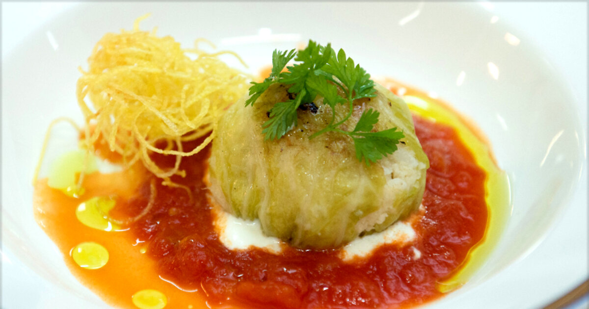 Голубцы с палтусом, савойской капустой, мацони и томатами с тархуном