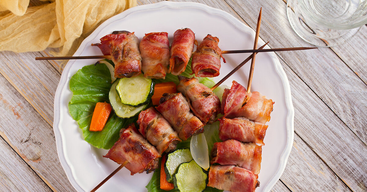 - Обернуть каждый кусочек кролика беконом, проткнуть деревянной палочкой и обжарить на гриле до золотистой корочки.