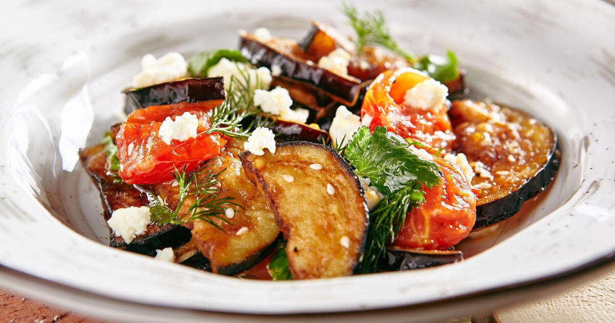 «Нарежьте баклажаны (2 шт.) небольшими брусочками и выложите на сковороду с разогретым постным маслом (2 ст. л.). Обжаривайте, периодически помешивая, около 15 минут. Влейте соевый соус (2 ст. л.), готовьте еще пару минут и остудите. Измельчите чеснок (1 зубчик) и грецкие орехи (2 ст. л.). Нарежьте помидоры (3 шт.) и брынзу (150 г) небольшими тонкими полосками. Смешайте все ингредиенты, посыпьте перцем (по вкусу) и украсьте рубленым зеленым луком».