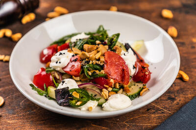 «Такой салат совсем несложно готовить самому! А итог получается весьма красивым и аппетитным. Свежая зелень, жирная рыба и семена. Для заправки, прямо как рекомендуют врачи, натуральный йогурт», — говорит известный телеведущий и врач по образованию Сергей Малозёмов.