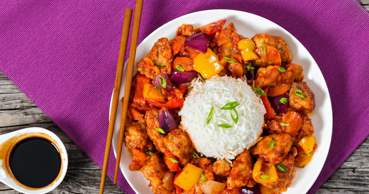 К овощам добавить свинину в маринаде, консервированные ананасы и томатную пасту.
