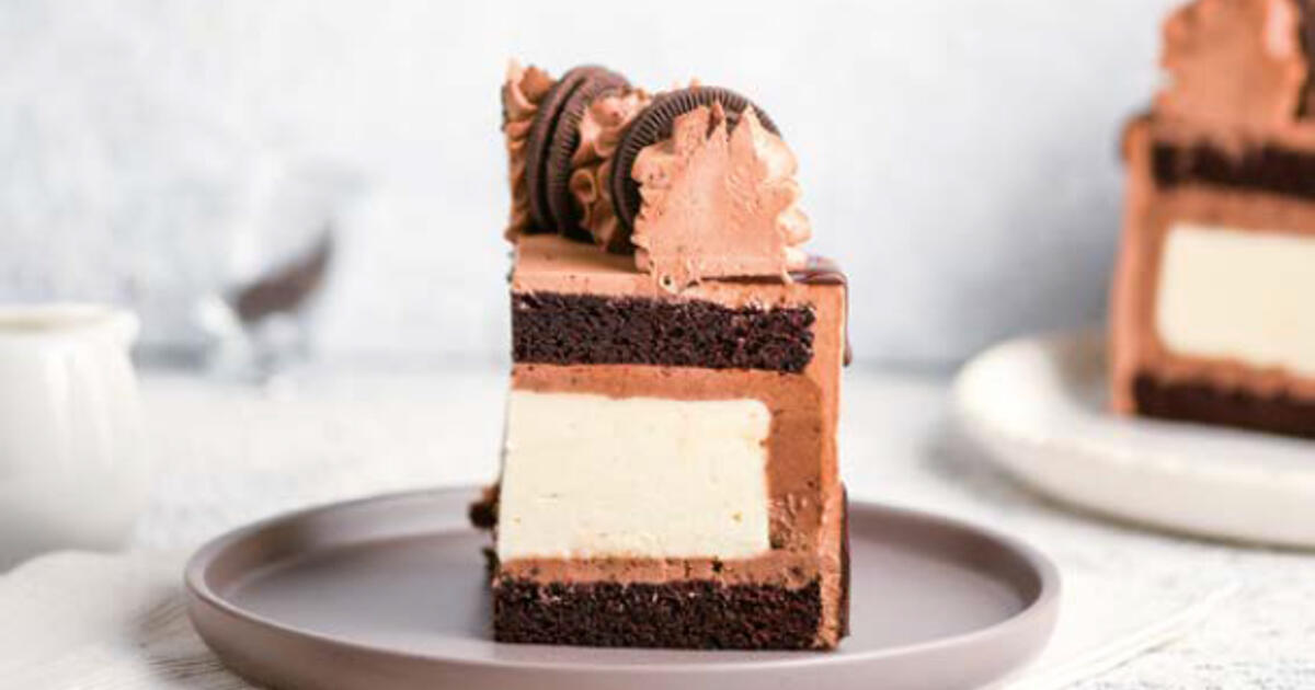 Взять первый бисквит (по размеру он не должен быть меньше кольца, в котором выпекался), пропитать. Распределить по бисквиту шоколадный крем (высота слоя – 1 см). Выложить посередине чизкейк.