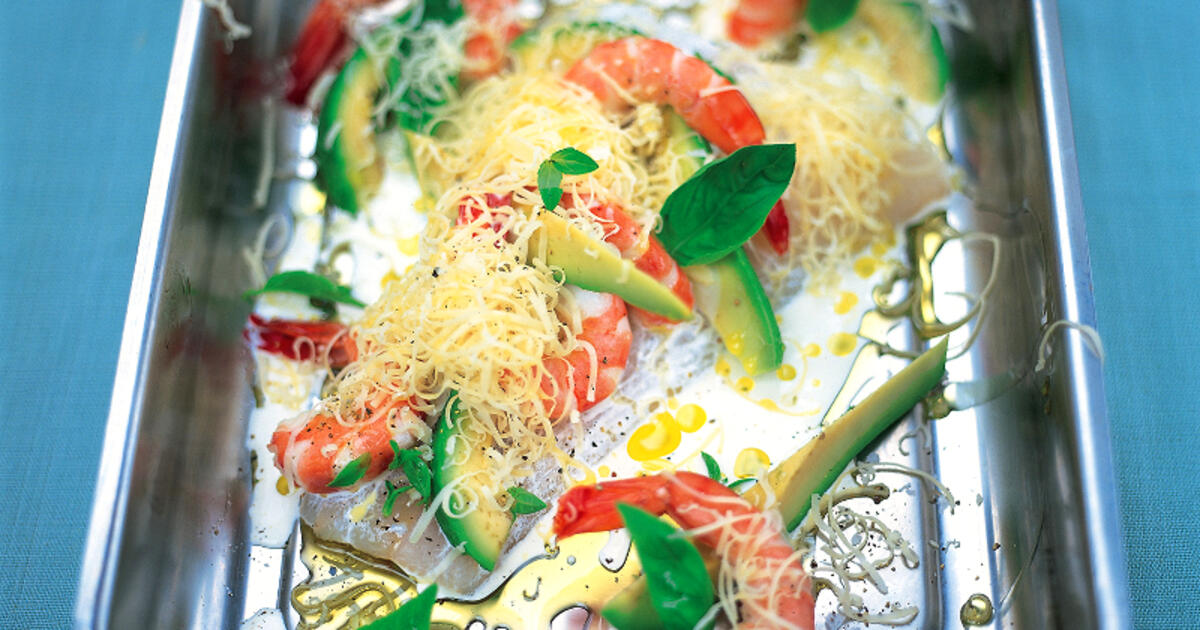Разогрейте духовку до температуры 220 °С. Смажьте жаропрочную форму небольшим количеством оливкового масла, посолите и поперчите треску с обеих сторон, поместите в форму. Украсьте базиликом, положите сверху авокадо и креветки, полейте сливками и посыпьте сыром чеддер.