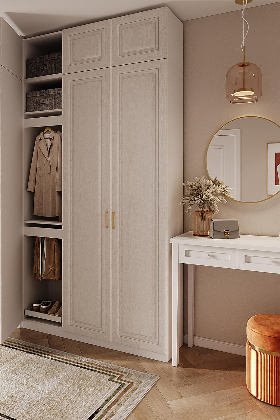 Во-первых, вы можете создать ее сами (или воспользоваться бесплатным проектом от дизайнеров Hoff, где учтут каждый сантиметр). Здесь на ваш выбор шкафы-купе или прямые и угловые модули с распашными дверями. Во-вторых, гибкая система монтажа позволяет перенастроить внутреннее наполнение за несколько минут. Купили новый объемный пуховик? Просто перевесили полку выше. Сменился сезон? Убрали «лето» наверх, «зиму» – вниз. В-третьих, петли с 3D-установкой выдерживают до 60 тысяч циклов открывания, а значит, шкаф прослужит долго даже при активном использовании.
