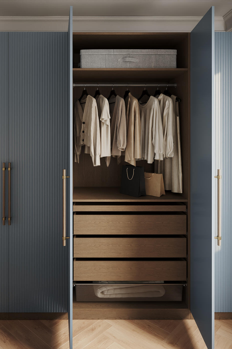 Каждая деталь гардеробной системы Блокс – от каркаса до фурнитуры – выдержана в единой цветовой палитре. А уникальный декор фасадов из дуба в трендовых оттенках (таких в масс-маркете больше не найти) сделает ваше пространство визуально дорогим и стильным.