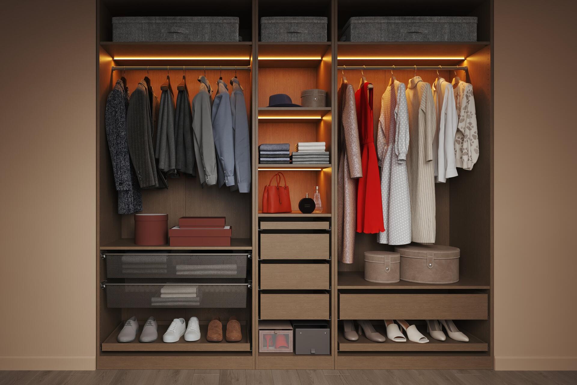 Когда вы живете вдвоем, важно сохранить баланс. Часто девушкам нужно много места для одежды и аксессуаров, а мужчинам – для строгих костюмов и рубашек, которые нельзя мять.