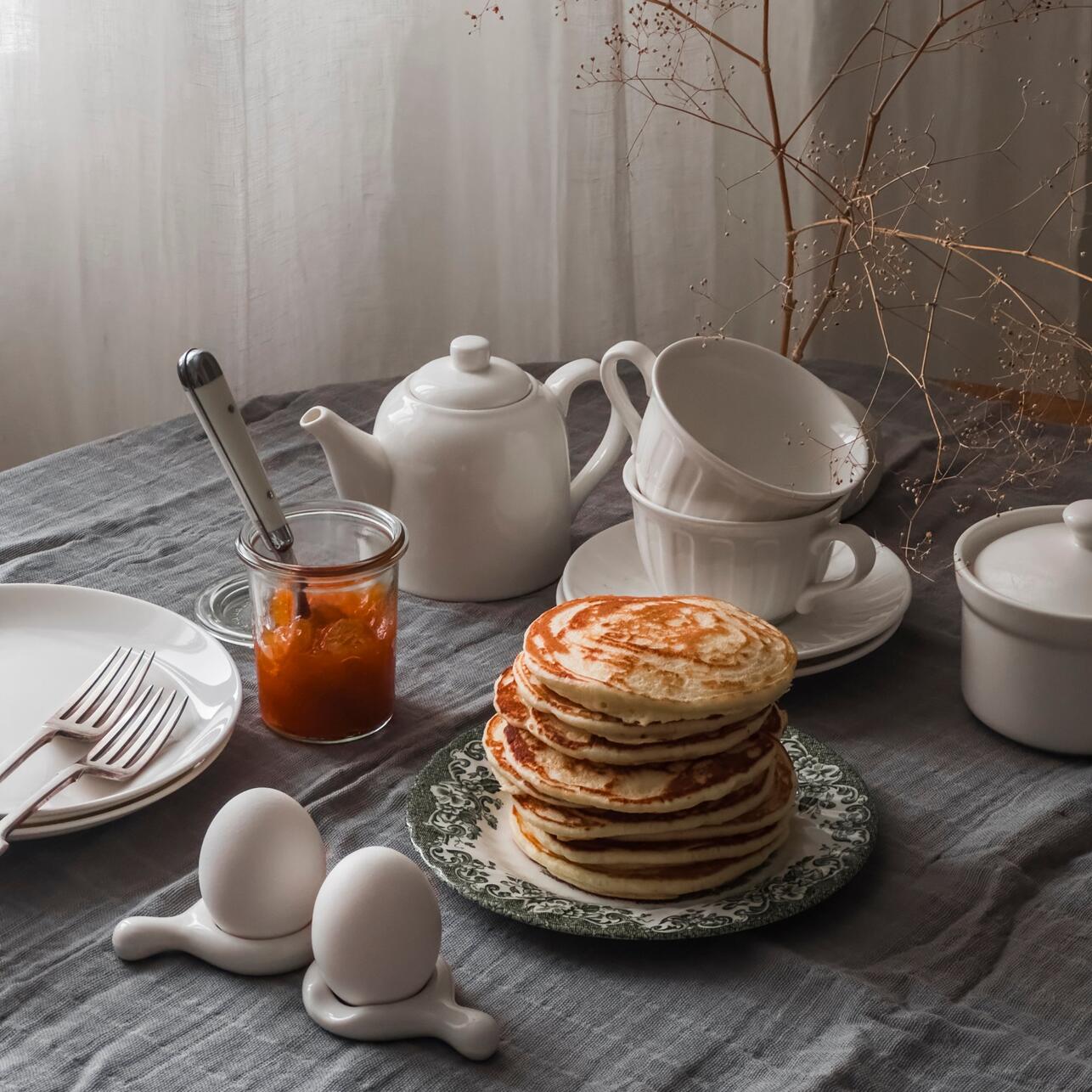 Здесь два пути, и оба хороши. Первый: найти посуду с народными мотивами, хохломской росписью или гжелью — такая сервировка сразу задает тематику и создает ощущение настоящего русского праздника. Второй: взять простую керамику в теплых оттенках — охра, терракот, молочный белый — и добавить характер через текстиль и декор. Главное условие — посуда должна быть одного стиля. Смешивать хохлому с минималистичной скандинавской керамикой не стоит: праздник получится, а вот атмосфера — нет.