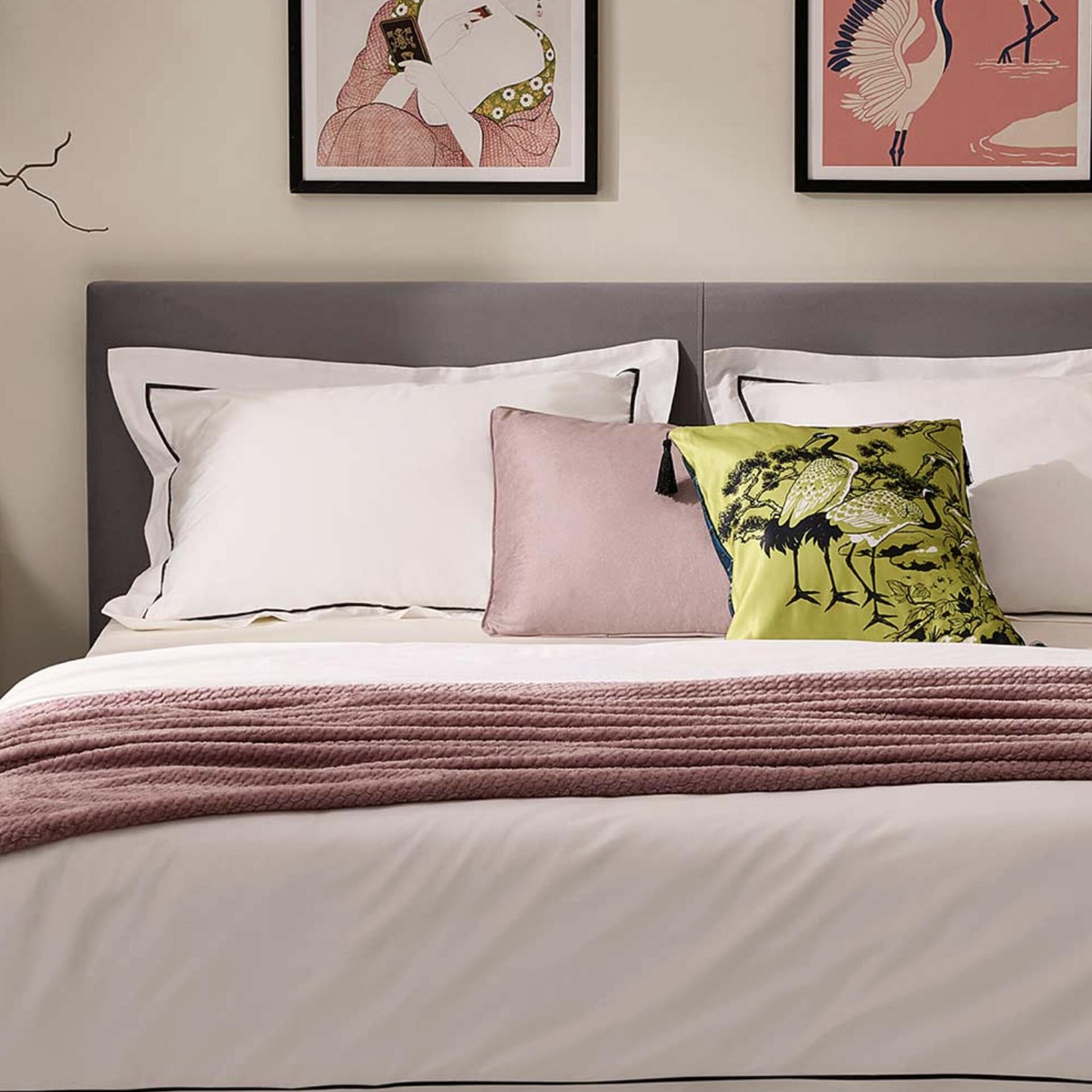 Белоснежное белье — это вечная классика. Но в 2026-м в моду вошел графичный акцент. Тонкий контрастный кант (черный или темно-синий) превращает обычную простыню в элемент высокого стиля. Это идеальный холст для ярких декоративных подушек или фактурного пледа.