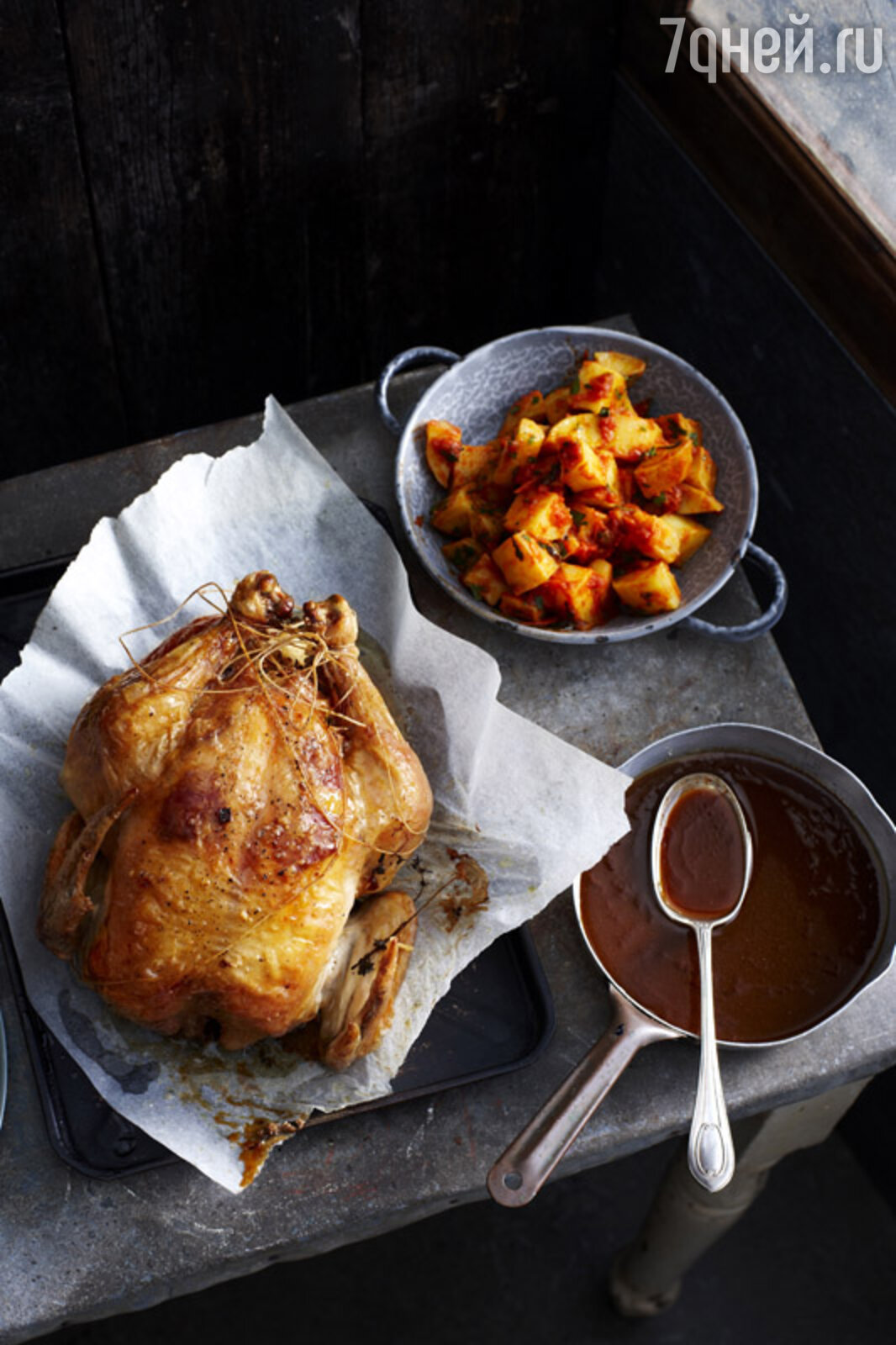 Абрикосы (600 г) разрезать пополам, извлечь косточки и мелко нарезать мякоть. Луковицу нашинковать соломкой. 4 куриных окорочка посолить-поперчить по вкусу, поместить в форму для запекания, залить 300 мл куриного бульона, разбавленного 2 ст. л. яблочного сока, накрыть форму фольгой и поставить в разогретую до 180 градусов духовку на 30 минут. Затем форму вынуть, полить окорочка 2 ст. л. яблочного сока, добавить абрикосы и лук и снова поставить открытую форму в духовку на 20 минут. Готовую закуску выложить на блюдо и украсить веточками петрушки.