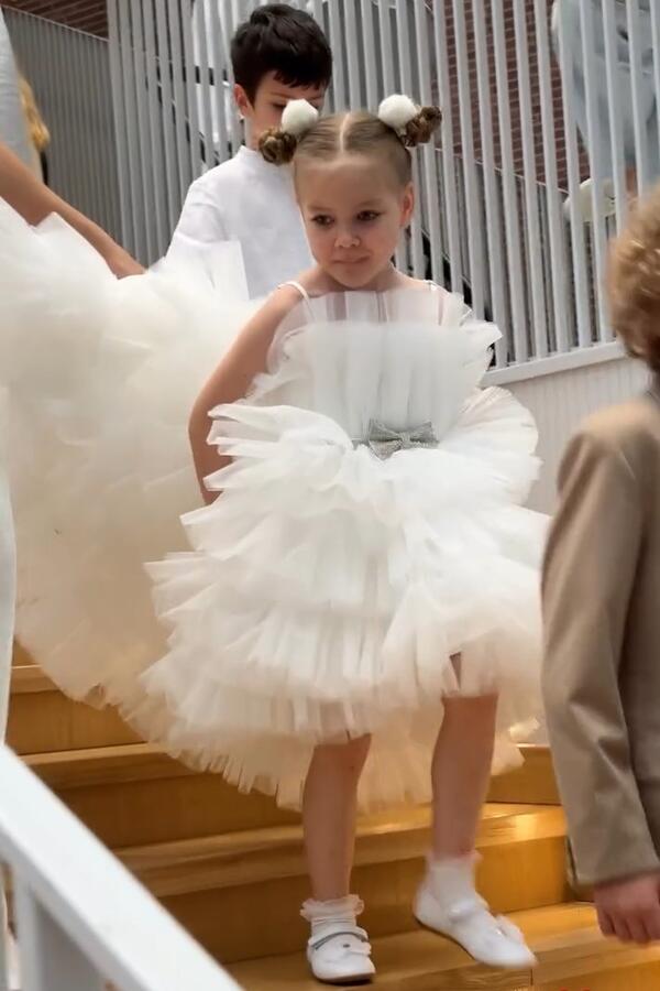Ведущая купила для своей дочки роскошное белое платье со шлейфом. Образ юной выпускницы дополнила аккуратная прическа с двумя «гульками», а также туфли с бантиками. Сама Кудрявцева тоже пришла на праздник в белом. Она приняла непосредственное участие в ответственном мероприятии — исполнила для детей песню вместе с другими родителями.В