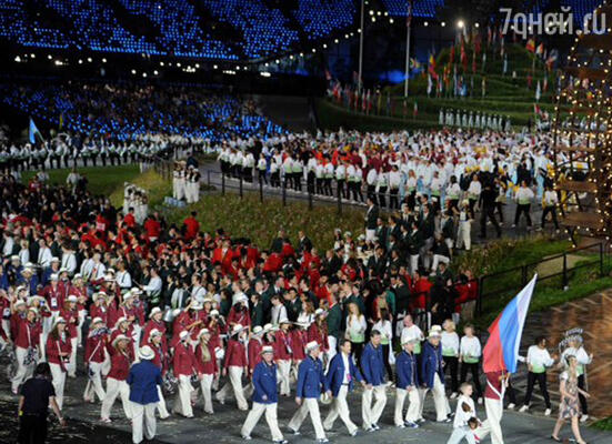 Кульминацией праздника стал парад олимпийцев. Российскую сборную возглавила теннисистка Мария Шарапова. А во время шествия команды хозяев на арену посыпались семь миллиардов лепестков роз — по числу жителей планеты. Множество мировых знаменитостей стали зрителями и участниками великолепного шоу, продолжавшегося 3 часа 48 минут. Королевское семейство Великобритании прибыло на праздник в полном составе — за исключением королевы, которая эффектно появилась сразу после демонстрации ролика с участием агента Её Величества в исполнении Дэвида Крейга: видео показало, как агент 007 доставляет королеву на вертолете из Букингемского дворца.