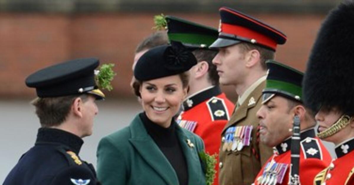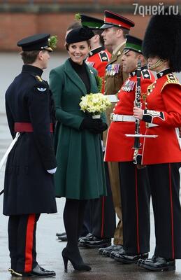 Принц Уильям с супругой вручили символические букетики клевера гвардейцам ирландского полка на ежегодном параде в честь дня святого Патрика в Олдершоте графства Хэмпшир. Сержант, которого наградили медалью за выслугу лет, рассказал Кейт, что у него есть 7-месячный сын Тео.