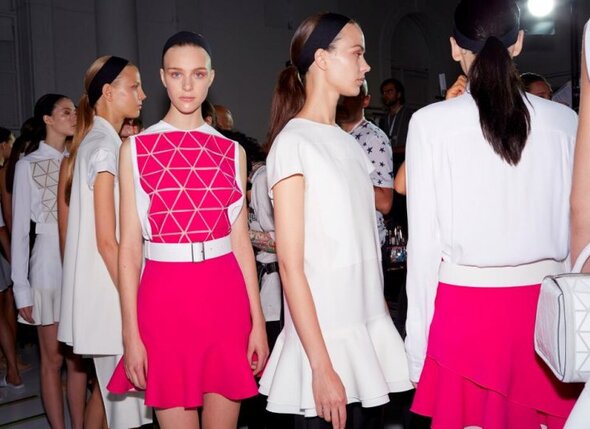 Коллекция Виктории Бекхэм была выполнена в черно-белой гамме с яркими розовыми и бордовыми вставками. Лаконичный крой модельер сочетает с оригинальными элементами: плиссированными юбками, оборками и графическими элементами.