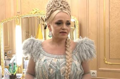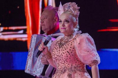 Для выступления Надежда выбрала яркое нежно-розовое платье и кокошник, дополнив образ крупным колье и серьгами.