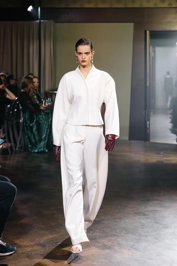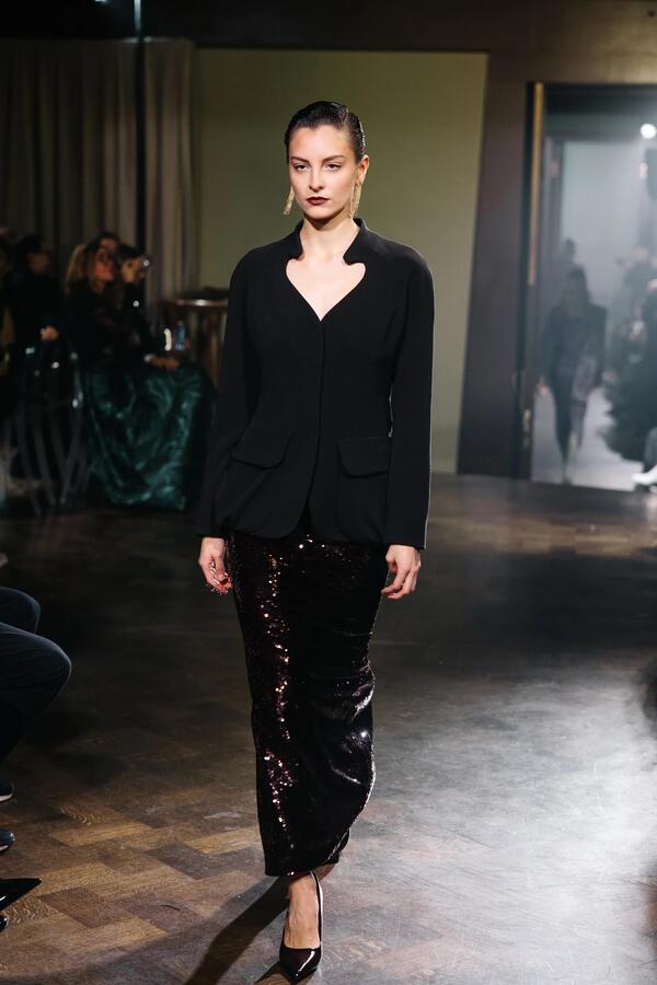 Коллекция охватывает все ключевые элементы гардероба современной женщины: брючные костюмы, деловые платья, трикотаж, брюки, юбки, жилетки и вечерние наряды. Особое место отведено жакетам и корсетным платьям с объемными рукавами.