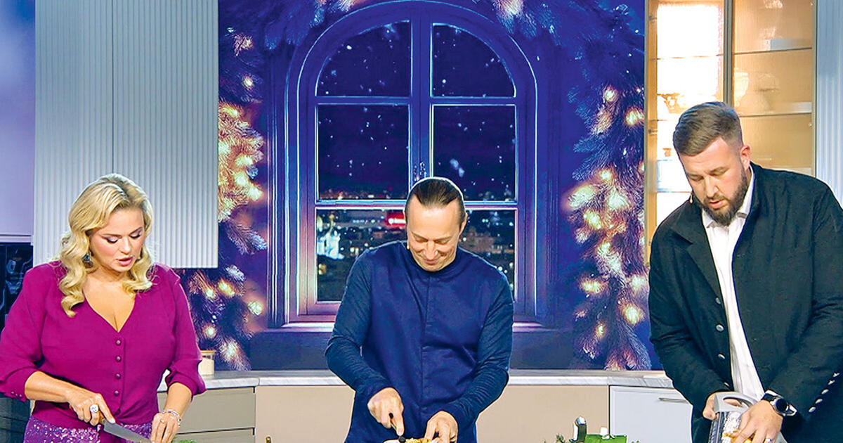 В новогоднем эфире Пятого канала зрителей ждет уникальная премьера — «Музыкально-кулинарное шоу «Поём и готовим», единственное в стране такого формата. Еще до полуночи можно начать встречать праздник в компании ведущих — Анны Семенович и шеф-повара Василия Емельяненко. Он подготовил специальное меню, которое познакомит телезрителей с богатой кухней народов нашей большой страны. Кулинарное путешествие начнется с Дальнего Востока, с закуски «Камчатская». А всего в праздничное меню вошло девять наименований, включая северный сугудай, пермские посикунчики, мини-бургеры с хамсой с Черноморского побережья, сибирский черемуховый пирог и селедку под шубой с секретным ингредиентом. Готовить кулинарные шедевры Емельяненко помогут ведущие актеры сериалов Пятого канала — «Филин», «Витязи», «Свои», «Крепкие орешки», «Великолепная Пятерка», «Наш спецназ» и «Лицемеры».