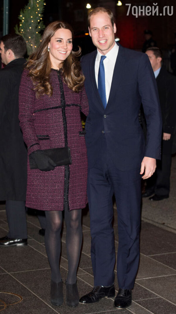 Герцог и герцогиня Кембриджские приземлились в аэропорту Нью-Йорка в воскресенье, 7 декабря, около пяти часов вечера. Из самолета беременная Кейт вышла в теплом пальто бордового цвета от Seraphine. Этот зимний ансамбль дополнили черные замшевые ботильоны, черный клатч и перчатки. Уильям оказался более морозоустойчивым и появился в аэропорту в темно-синем классическом костюме.