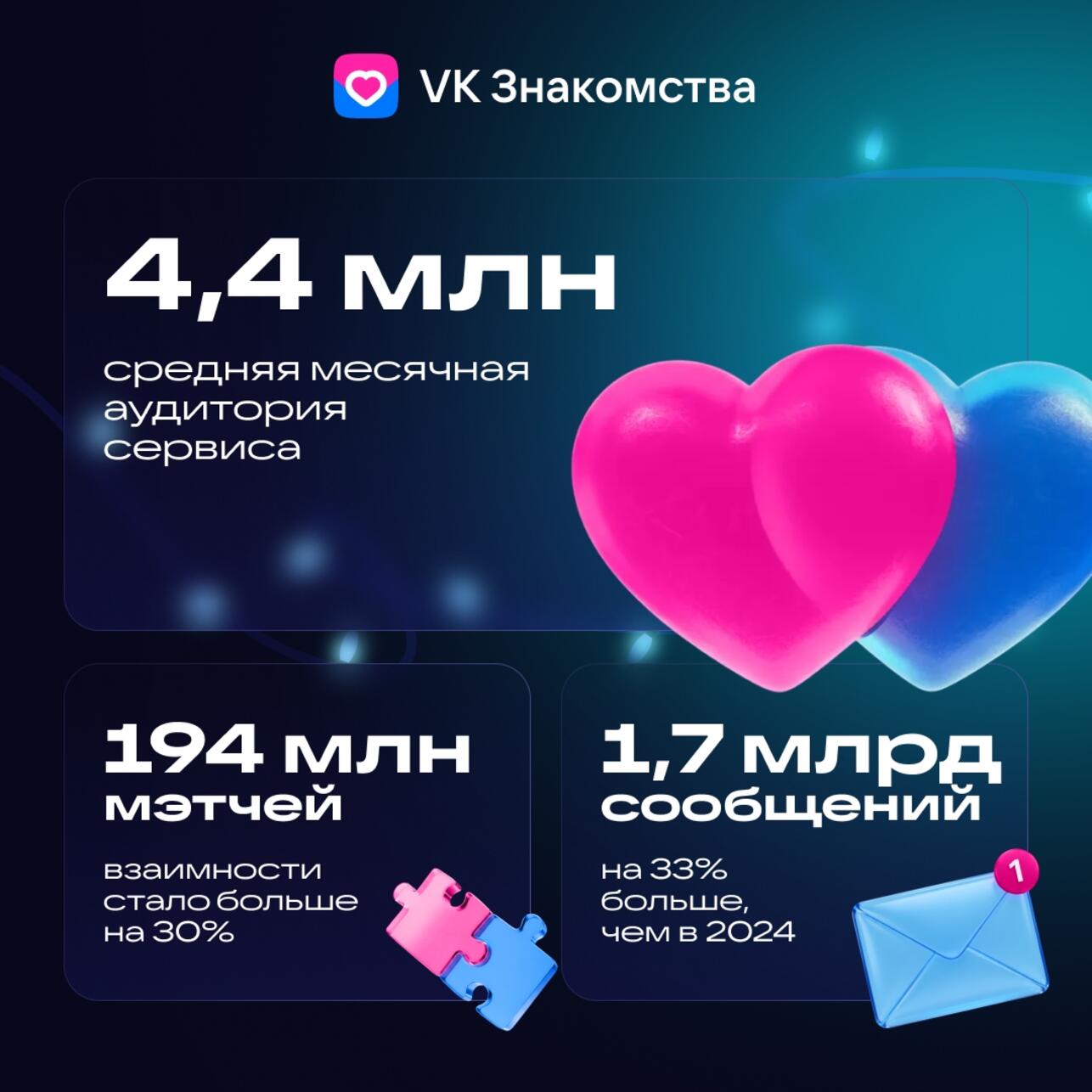 В 2025 пользователи совпали в 194 млн мэтчей, что на 30% больше по сравнению с прошлым годом. Количество сообщений, которые партнёры отправили друг другу, увеличилось на 33% и составило 1,7 млрд. Благодаря росту активности пользователей средняя месячная аудитория за 2025 год выросла на 21% и достигла 4,4 млн.