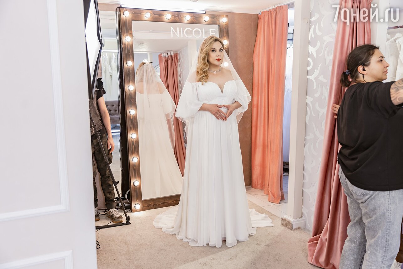 Первое платье для примерки выбрали Лора и Света, второе — Карина, а третье — звездный стилист и ведущий проекта Бичолла Тетрадзе. Первый вариант — белое классическое платье с открытыми плечами —В не понравился невесте.