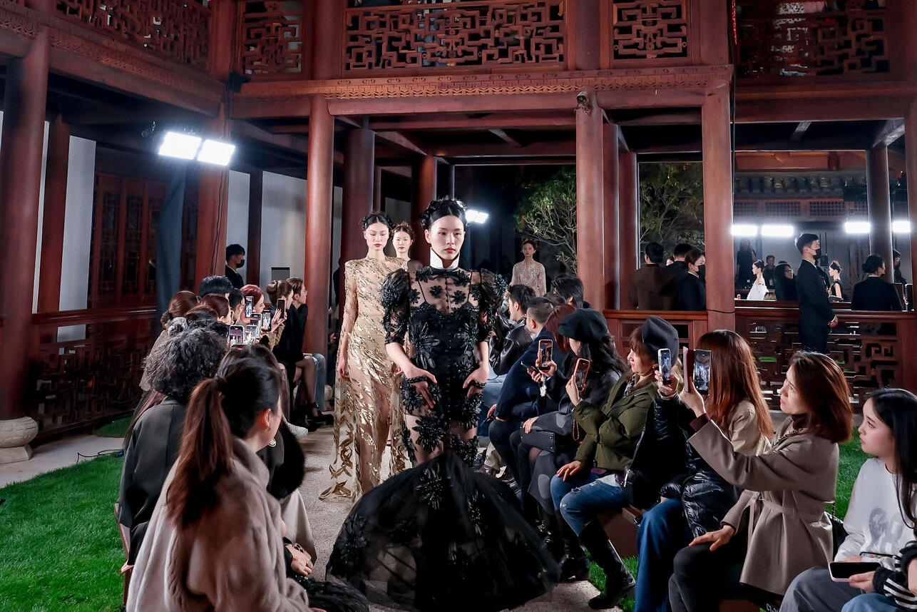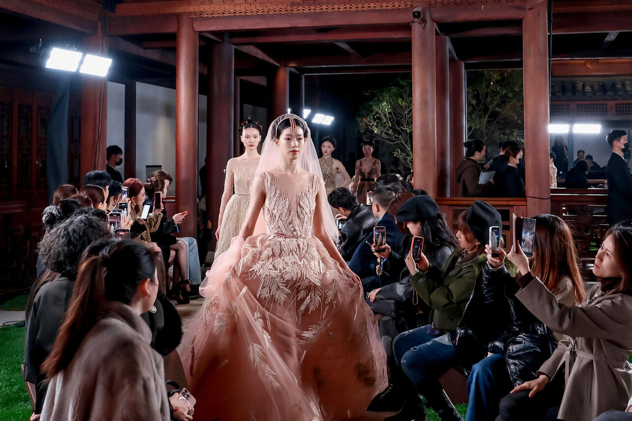 Местом проведения стал живописный город на воде Пуюань — и сама природа создала впечатляющую сценографию. Дефиле на набережной превратилось в настоящий иммерсивный спектакль, где архитектура, водная гладь и haute couture дополнили друг друга.