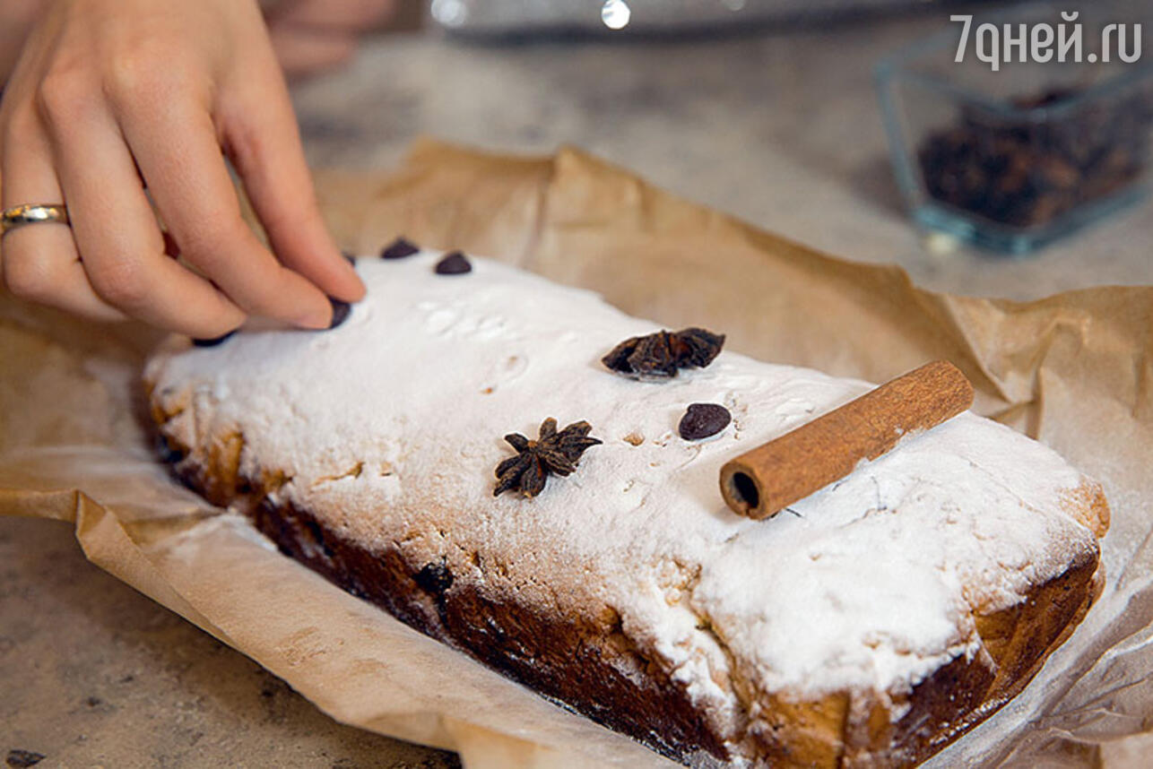 Муку (500 г) просеять с сахарной пудрой (100 г), добавить разрыхлитель (8 г). Сухофрукты (200 г) промыть, оставить в теплой воде для размягчения. Воду слить, залить сухофрукты ликером амаретто (100 мл). В молоко (100 мл) добавить сухие дрожжи (8 г), щепотку сахарной пудры и оставить на 15 минут. В мучную смесь добавить сливочное масло (200 г), молоко, цедру апельсина (5 г) и сухофрукты с ликером. Замесить тесто, накрыть полотенцем и дать полежать 30 минут. Раскатать тесто толщиной 3—4 см и выложить натертый черный шоколад (100 г) на одну из половин. Прикрыть свободной частью теста, переложить на застеленный пергаментом противень и отправить в разогретую до 160 градусов духовку на 1 час. После выпечки посыпать сахарной пудрой.