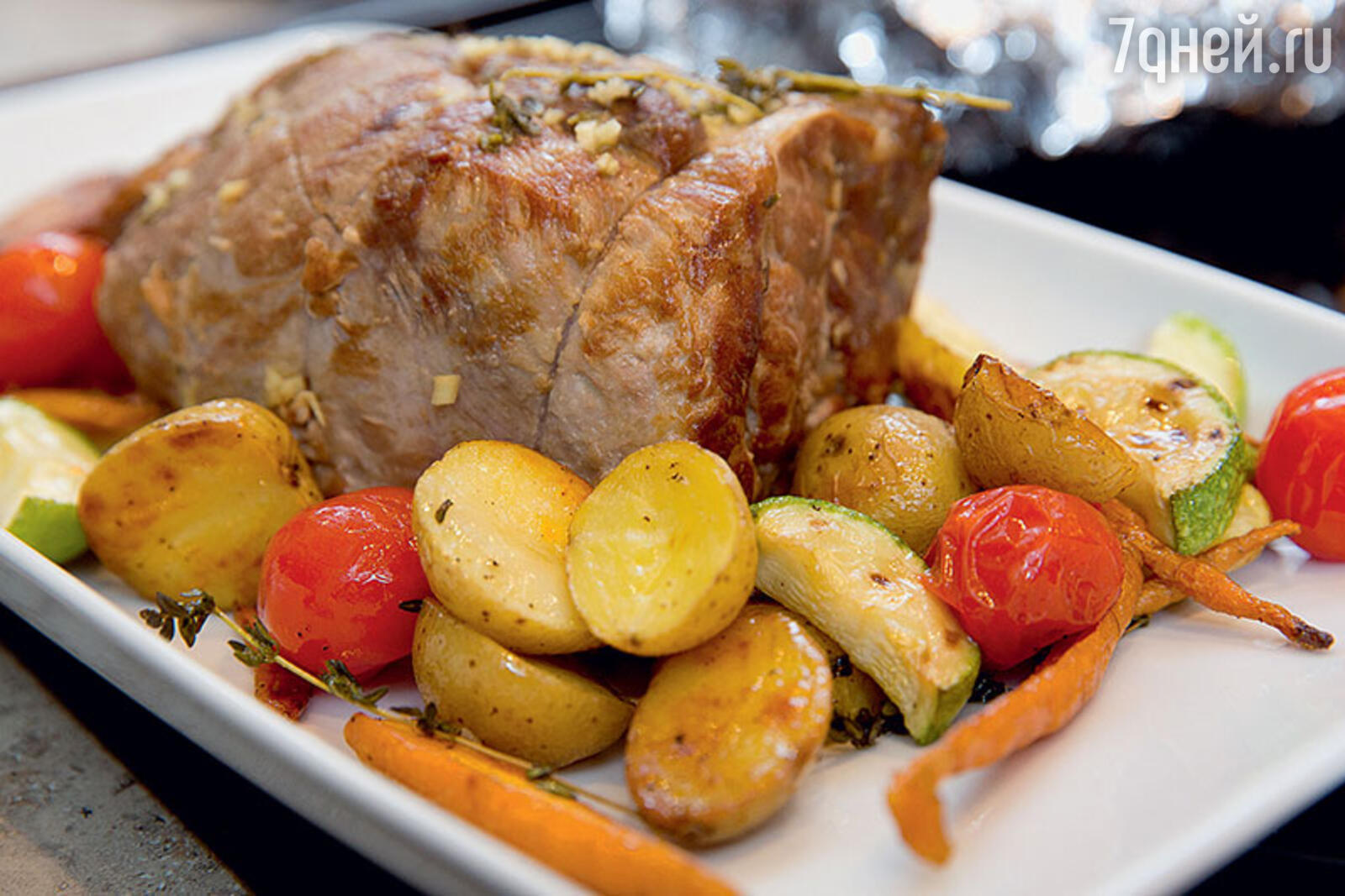 Овощи (200 г мини-картофеля, 200 г мини-моркови, 200 г кабачков, 200 г помидоров черри) обработать, кабачки и морковь крупно порезать. Добавить чеснок (дольку), тимьян (5 веточек), оливковое масло (50 мл), соль и перец по вкусу и все это отправить в духовку к свинине на 30 минут.