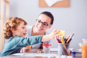 Воспитатель Ня и малышка Гуди предлагают порисовать вместе.