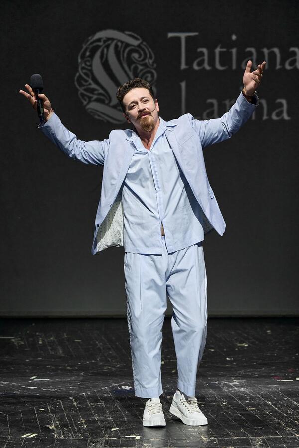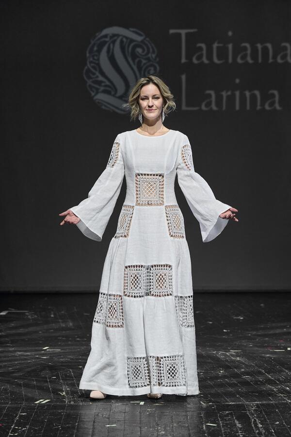 Магия модного спектакля продолжилась в зале, когда все расселись по местам и зазвучала музыка. Суперфиналист проекта «Голос» Ив Набиев, который тоже стал участником праздника, исполнил композицию «Сказка». Именно под нее выходили на сцену модели в нарядах из праздничной коллекции «Воскрешая мечты». Снежно-белое кружево из середины прошлого века оказалось органично вписанным в современные образы. В элементах одежды уже сложно было узнать ажурные уголки наволочек и зубчатые края подзоров, однако скатерти в заключительных образах показа использовались осознанно дерзко. С самого начала существования бренда Tatiana Larina заметную роль в изделиях играло кружево. В представленном показе именно старинное кружево кроше зазвучало с новой силой. Начиная с 50-х годов прошлого века, такое вязали из белых катушечных хлопковых нитей, чтобы добавить уюта в свой интерьер. А платья с элементами этих кружев и тогда смотрелись просто фантастически! А теперь создательницы бренда Ольга Творогова и Ольга Любина вдохнули в старинное кружево новую жизнь, используя его в современных нарядах и аксессуарах. При этом они, в традициях русской моды, работают только с натуральными материалами. Современные ткани сложных фактур из шерсти, шелка, льна, хлопка и крапивы становятся основой для элегантных платьев и костюмов. Палитра бренда состоит из природных приглушенных цветов, Tatiana Larina использует, в том числе, и собственные принты в сложных цветовых сочетаниях. В каждое их изделие хочется всматриваться, отыскивая интересные неброские детали, подчеркивающие высокий статус обладательницы одежды.