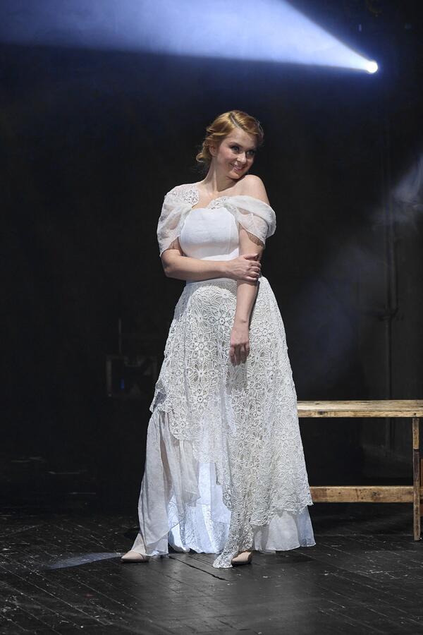 «Когда меня пригласили на юбилей, который должен был пройти в театре, я подумала: это наверняка будет что-то интересное, — поделилась своими эмоциями Яна Крайнова. — Так и оказалось. За пару часов до показа я узнала, что нам с Катей Копановой нужно вначале сымпровизировать — сыграть сценку из жизни русских женщин, некую интермедию. И мы сымпровизировали — как женщины выходят на речку с тазами стирать, а потом набрасывают на себя кружевные скатерти, как наряды... В показе праздничной коллекции вообще было много кружев. Мое белоснежное платье, например, было с вкраплением кружев 50-х годов XX века. И серьги из них же были сделаны. Платье шили специально для меня, и оно село идеально. Я, когда вышла на подиум, ощутила, что я будто Царевна Лебедь. Так и понесла себя... И когда мне потом говорили: ты была как Царевна Лебедь, я радовалась: вау, значит, ассоциация сработала!»