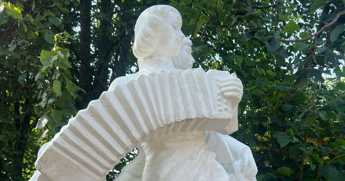 Скульптурная композиция несет в себе радость и полноту жизни, которую олицетворяет девушка с полными ведрами воды на коромысле, а также творческое начало, которое передает гармонист.