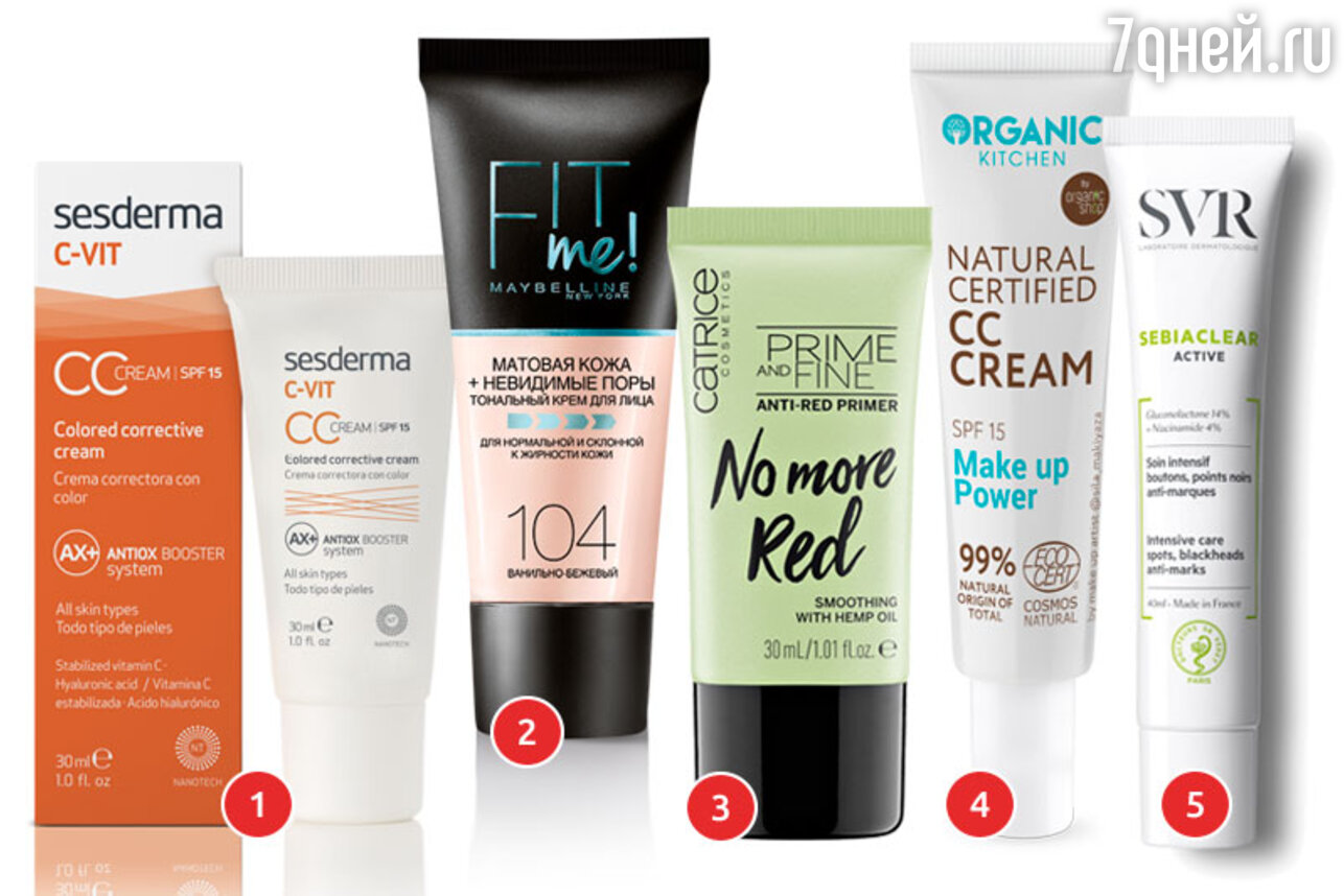 1.В Корректирующий тон кожи крем с витамином CC-Cream C-Vit SPF15 Sesderma. 2.В Тональный крем Fit Me Maybelline New York. 3.В Праймер против покраснений PRIME AND FINE ANTI-RED PRIMER CATRICE. 4.В Натуральный сертифицированный СС-крем Make up Power Organic Kitchen. 5.В Средство против воспалений и черных точек Sebiaclear Active SVR.В