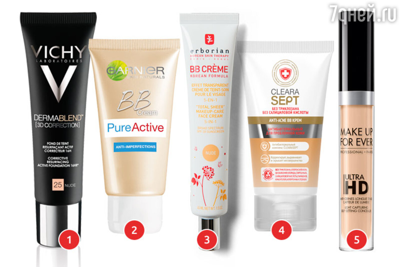 1. Тональная основа Dermablend 3D VICHY. 2. BB крем Чистая кожа актив Garnier. 3.В В ВВ крем натурально-бежевый Erborian. 4.В ВВ крем антибактериальный для проблемной кожи Anti-acne ClearaSept. 5. Высокопигментированный корректор Full CoverВ Make Up For Ever.