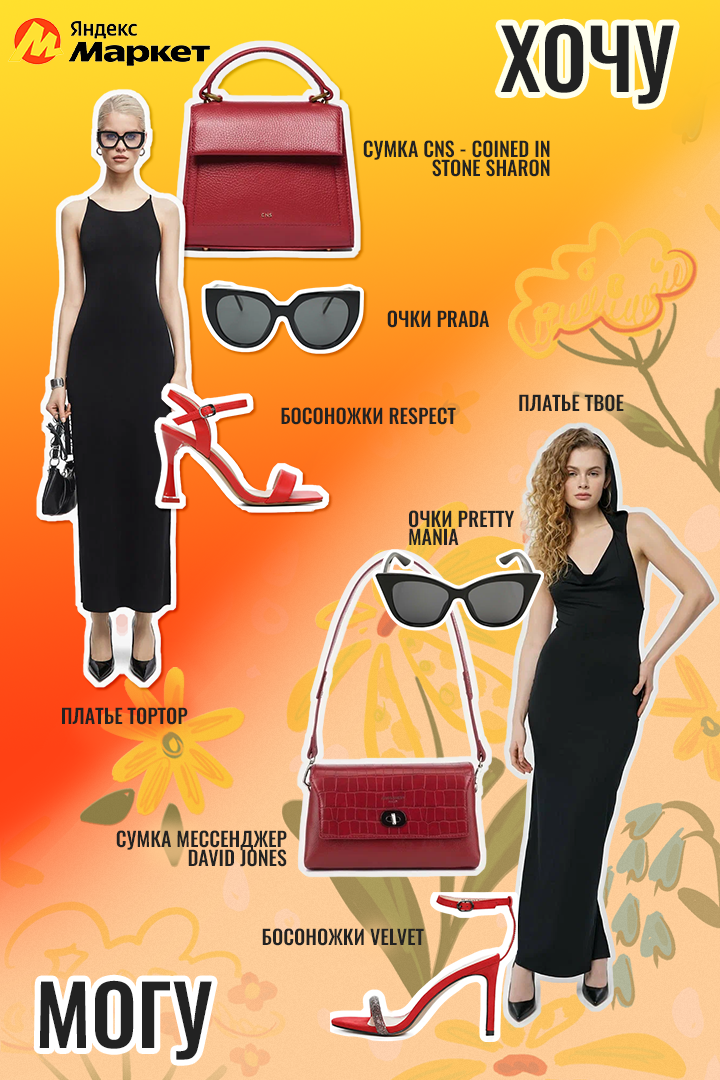 «Собрала образ с трендовым чёрным платьем макси на бретелях из ТОРТОР и сделала акцент с помощью красной сумочки с короткой ручкой от CNS и красных босоножек на невысокой шпильке Respect. Завершаю образ очками PRADA формы «кошачий глаз» — они добавят образу шика. Для такого платья подойдёт также сумка-багет на плечо.