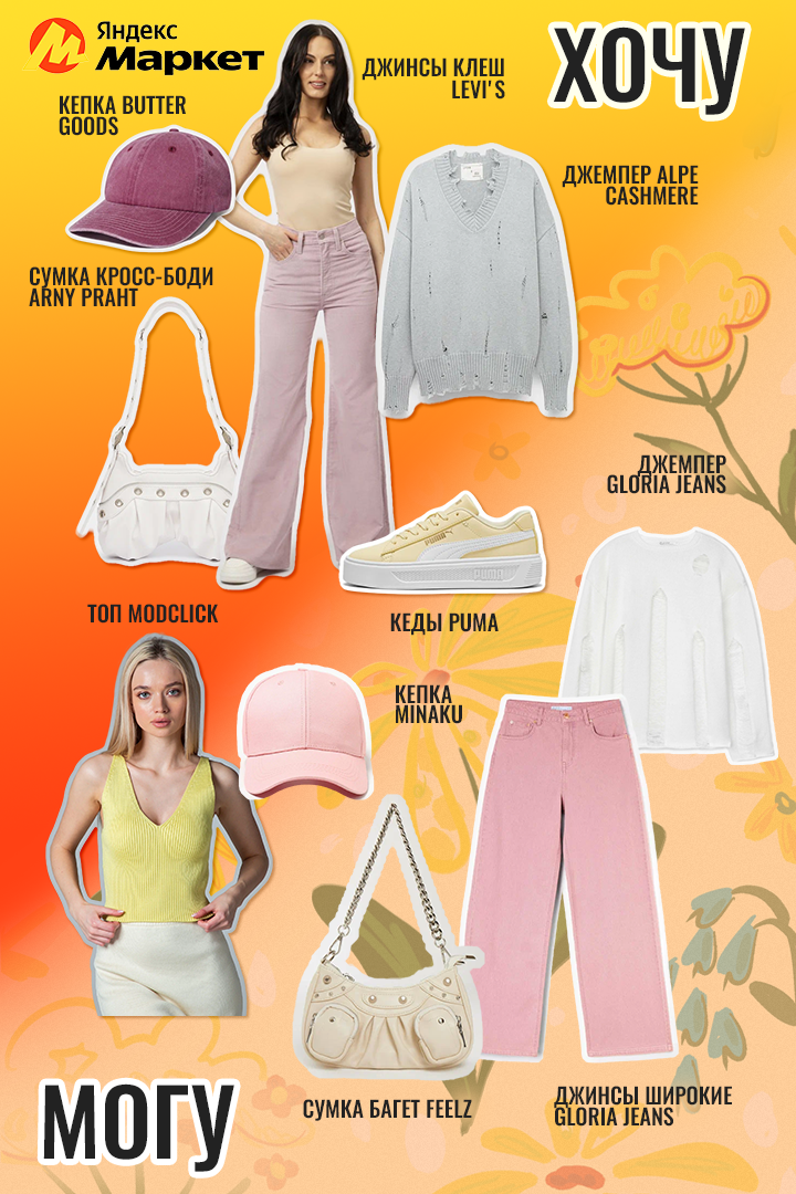 «Составим повседневный образ с жёлтым топом на широких бретелях. Топ можно надеть под хлопковый джемпер серого цвета Alpe Cashmere, который идеально сочетается с розовыми джинсами клёш от Levi’s. В качестве обуви я выбрала светло-жёлтые кеды PUMA на высокой подошве — они отлично смотрятся в комбинации с удлиненными моделями джинсов. Чтобы завершить образ, добавляю сумку от ARNY PRAHT и розовую кепку. Совет: если вы хотите сделать образ многослойным, всегда следите за балансом цвета и делайте мягкие переходы в оттенках»