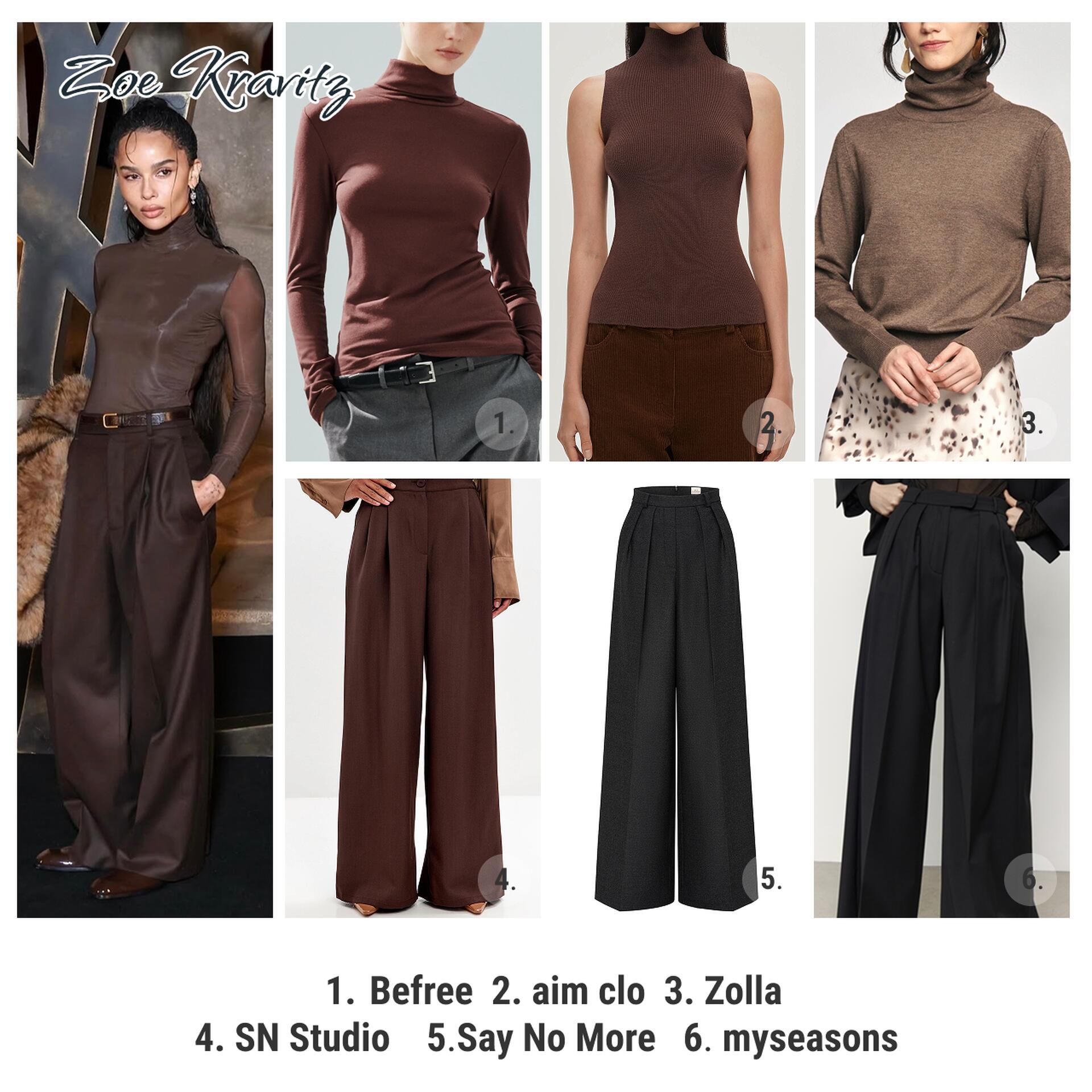 Запоминающийся выход Зои в марте — монохромный тотал-лук в глубоком коричневом оттенке эспрессо: полупрозрачная водолазка, широкие брюки с защипами, лакированные лоферы и меховая муфта.