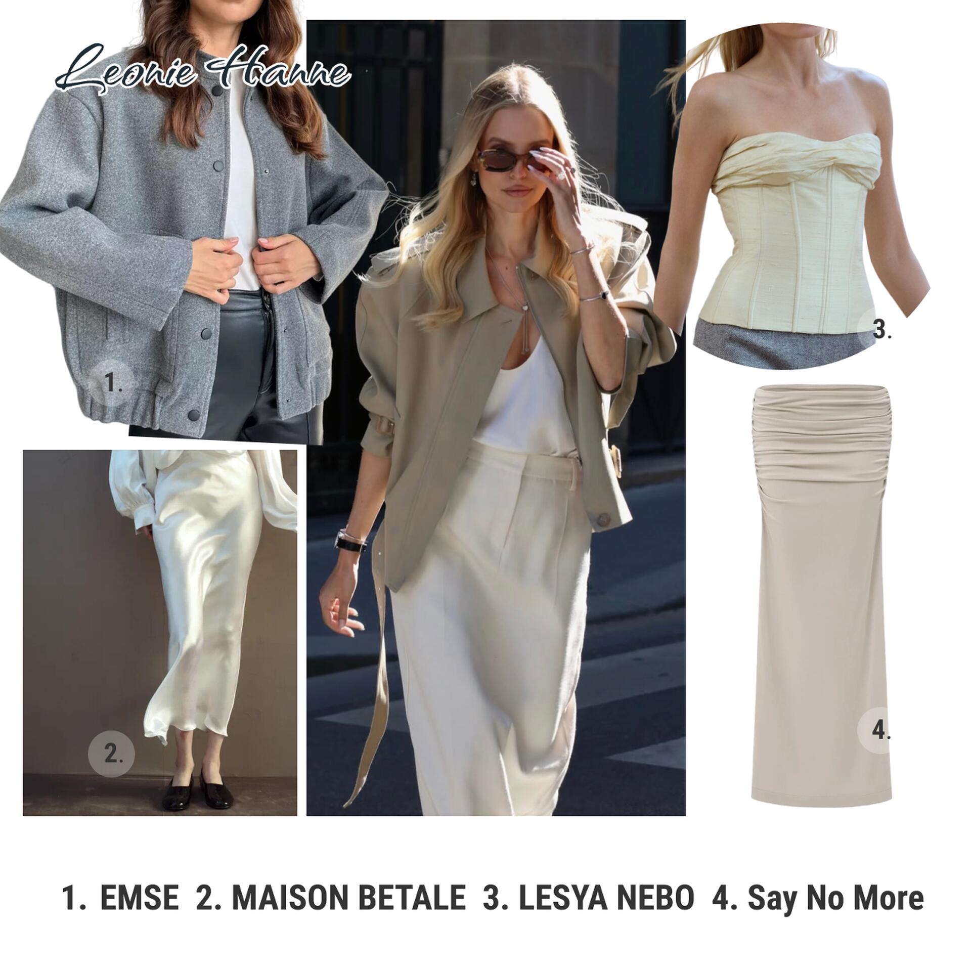 В этом расслабленном, но шикарном образе Леони мастерски смешивает ткани и фактуры, сохраняя цветовую гамму. Главное — не бояться экспериментировать и создавать свои собственные, уникальные сочетания.