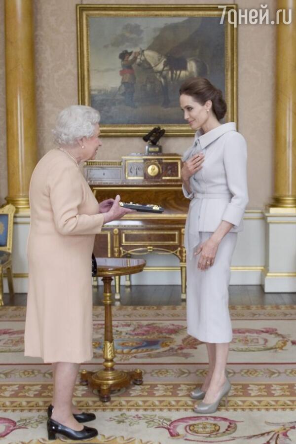 Анджелина Джоли, на днях получившая почетную награду из рук самой королевы Елизаветы II, выбрала для такого торжественного мероприятия весьма элегантный наряд.