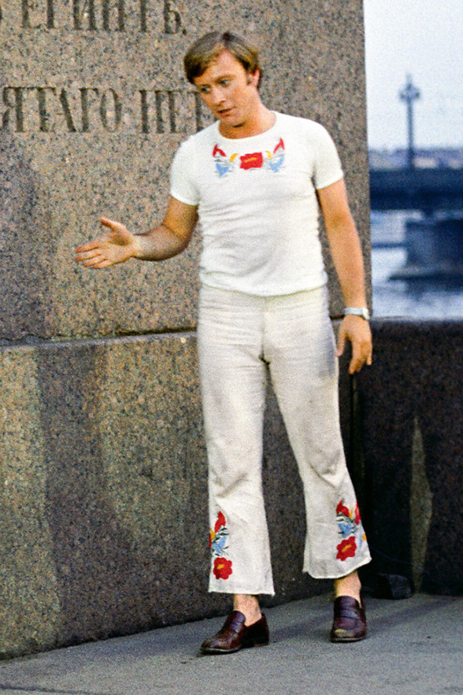 Эта шведская группа стала культовой в 70-е годы. Ее участники не только одевались в соответствии с модой той эпохи. Они были иконами стиля своего времени. Поп-звезды часто носили расклешенные джинсы и брюки, дополняли их курточками, жакетами или жилетами. Образы завершали высокие ботинки или сапоги на платформе. Посмотрите на клеш солисток на этой фотографии. Вот он — настоящий стиль 70-х. Артист Андрей Миронов очень любил эту группу. По воспоминаниям его приятелей, больше всего ему нравилась песня Hasta Ma?ana, он даже исполнял ее на дружеских вечеринках. Миронов тоже обожал носить брюки клеш. И в жизни, и на экране. На фотографии мы видим кадр из фильма «Невероятные приключения итальянцев в России», снятого в 1973 году. Герой Миронова одет по последнему слову моды.