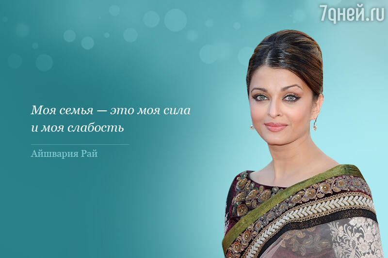 В апреле 2007 года Айшвария Рай (Aishwarya Rai), самая популярная актриса Болливуда, покорившая и неприступный Голливуд, вышла замуж. Избранником звезды фильмов «Девдас» (2002), «Невеста и предрассудки» (2004), «Принцесса специй» (2005), «Джодха и Акбар» (2008) стал индийский актер Абхишек Баччан (Abhishek Bachchan). 16 ноября 2011 года у пары родилась дочь Аарадхия. Рассказывая о близких в интервью, Айшвария светится нежностью и счастьем, говорит, что молится на ребенка и мужа, потому что они у нее идеальные. И признается, что именно о такой семье, любящей и заботливой, она всегда мечтала, поэтому готова ради любимых на любые жертвы, даже если речь идет о завершении успешной кинокарьеры: «Моя семья – это моя сила и моя слабость»