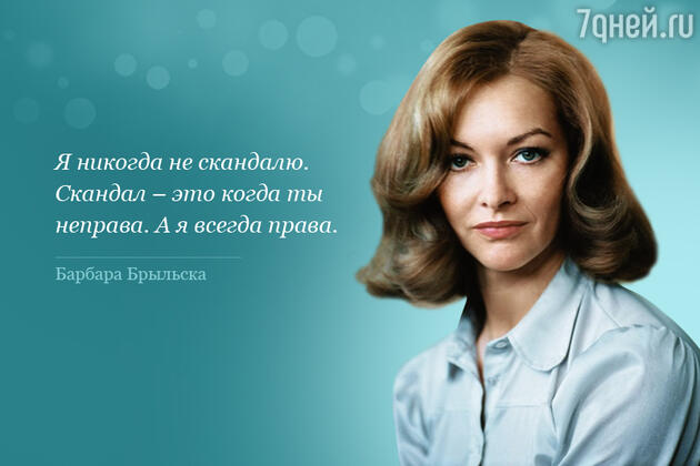 Свой идеал самодостаточного, сильного и надежного мужчины Брыльска пыталась найти в каждом из мужей. Но когда отношения исчерпывали себя, она выходила из них королевой:В «Я никогда не скандалю. Скандал – это когда ты неправа. А я всегда права»