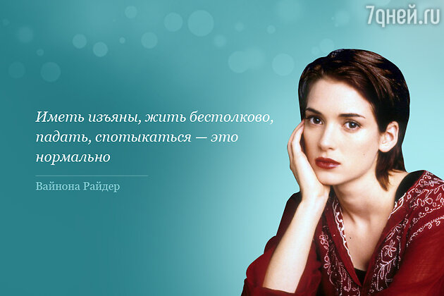29 октября у американской актрисы Вайноны Райдер (Winona Ryder) день рождения. Трудно поверить, что звезде с внешностью юной романтической барышни, которую мы любим за роли в фильмах «Эдвард Руки-ножницы» (1990), «Дракула» (1992), «Эпоха невинности» (1993), «Осень в Нью-Йорке» (2000), исполняется 43 года. Вайнона любит шутить на тему того, что природа наградила ее чертами хрупкого, ранимого эльфа и характером непослушного любознательного мальчишки. Истинной леди из нее никогда не получилось бы, уверена актриса. Ей нравится не лезть за словом в карман, проявлять инициативу, самой принимать решения, не перекладывая их на чьи-либо плечи, и нести ответственность за каждое свое слово, каждый поступок, даже если он не совсем правильный в глазах общества. Поступая так, ты живешь ярче и остаешься самим собой, а перфекционизм, желание быть идеальным во всем, напротив, делает тебя слабее, лишает больших и маленьких радостей бытия, считает Вайнона Райдер: «Иметь изъяны, жить бестолково, падать, спотыкаться – это нормально»